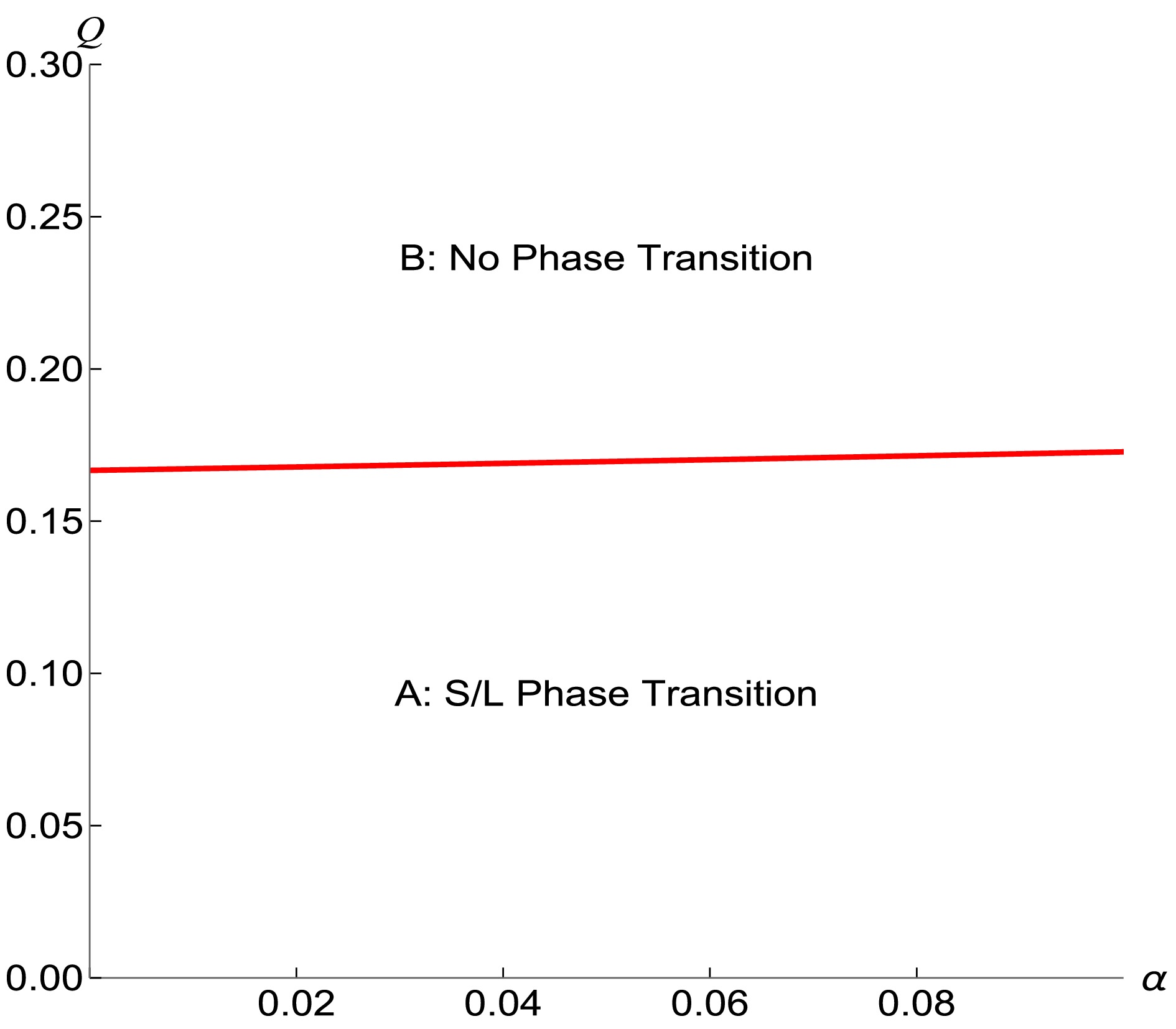 $ Q-\alpha $ ) space is shown in Figure 2. The curve divides the plane into two distinct regions. Region A corresponds to the parameter range in which the BH undergoes a S/L phase transition, while in Region B the BH remains in a stable single phase with no phase transition.From the above equation, we obtained the analytical solution at the critical point,