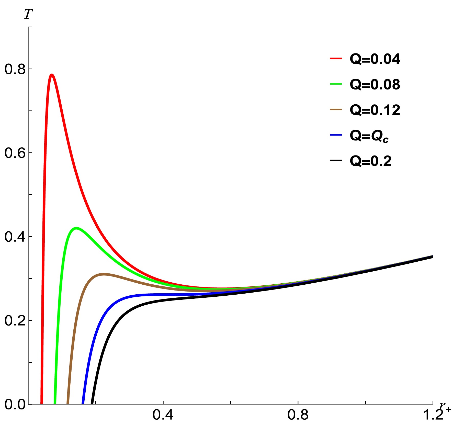 $ {\alpha}=0.04 $ ,$ l=1.00 $ , and get the values at the critical point as follows$ {r}_{+c}=0.411108,\quad {Q}_c=0.168965, \quad {T}_c=0.272423. $