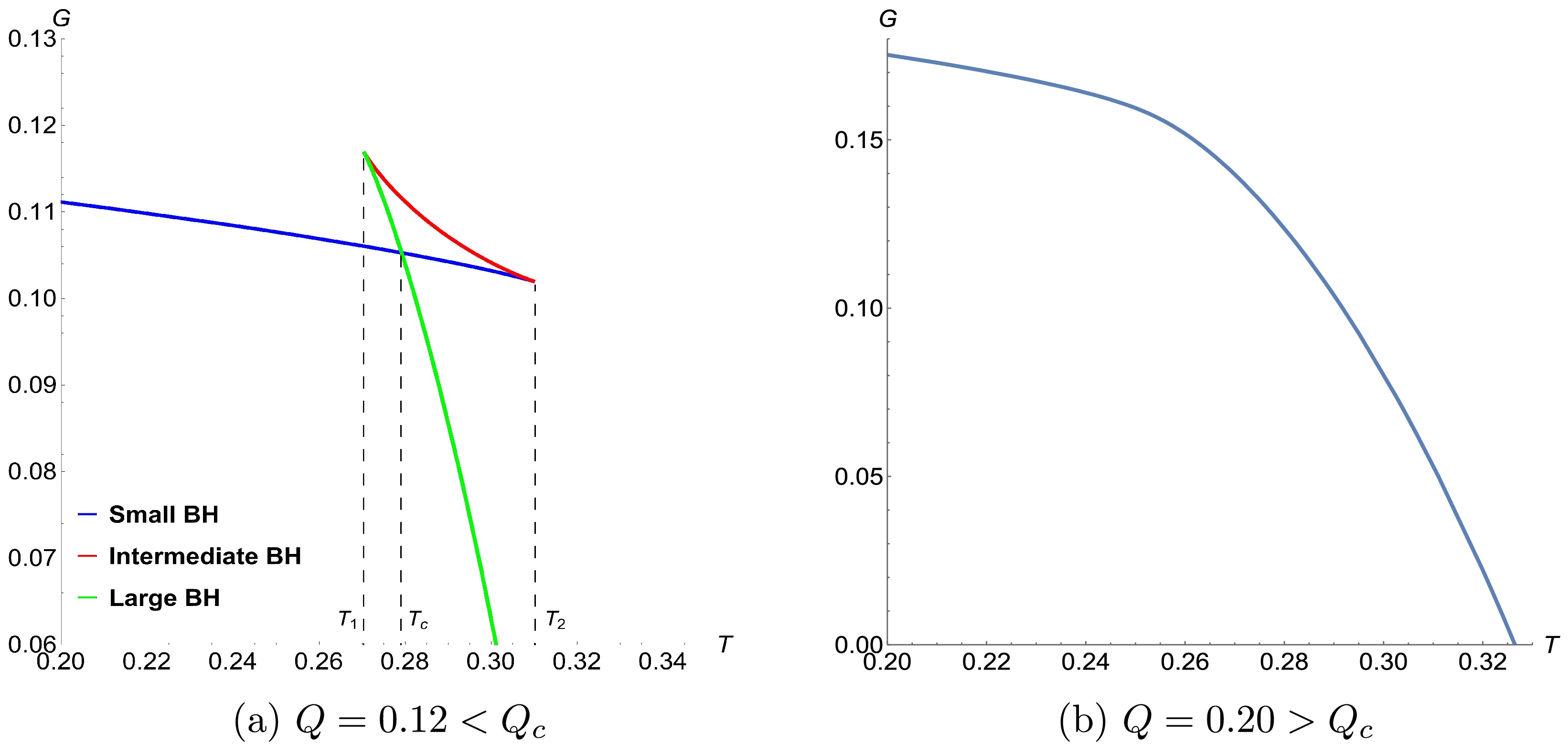 $ {Q}>{Q_c} $ . Conversely, when$ {Q}<{Q_c} $ , maximum values become evident in the plot. This phenomenon implies that the BH undergoes a transition to a multi phase state, with multiple distinct phases coexisting within its structure.
