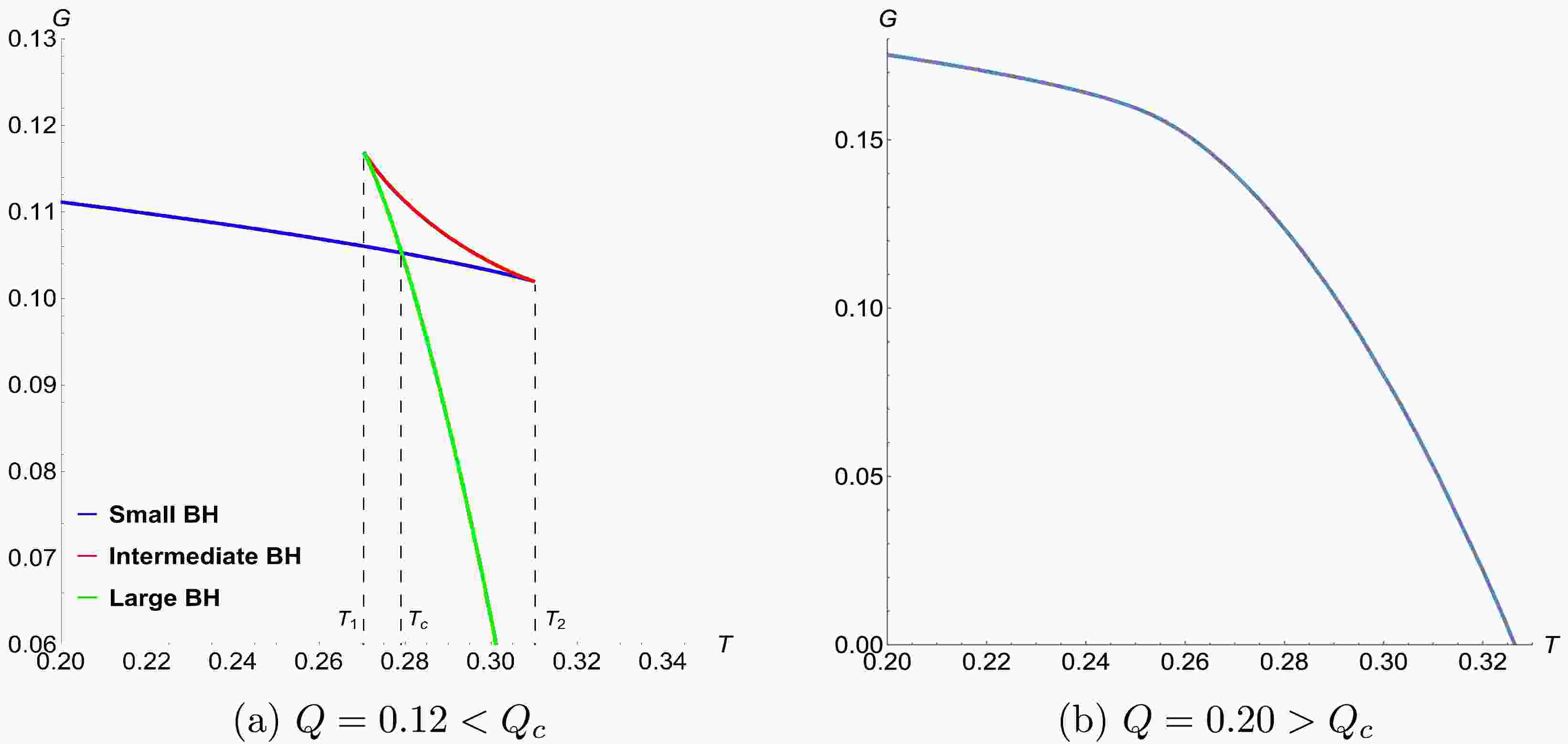 $ {Q}<{Q_c} $ , multiple phases emerge. These phases can be precisely categorized into three types: small BH, intermediate BH, and large BH. It is of great significance to note that these three BH phases coexist within the temperature range$ {T_1}<{T}<{T_2} $ . The temperature$ {T_c} $ marks the point where a first-order phase transition occurs. Conversely, when$ {Q}>{Q_c} $ , the BH system does not undergo any phase transition. -