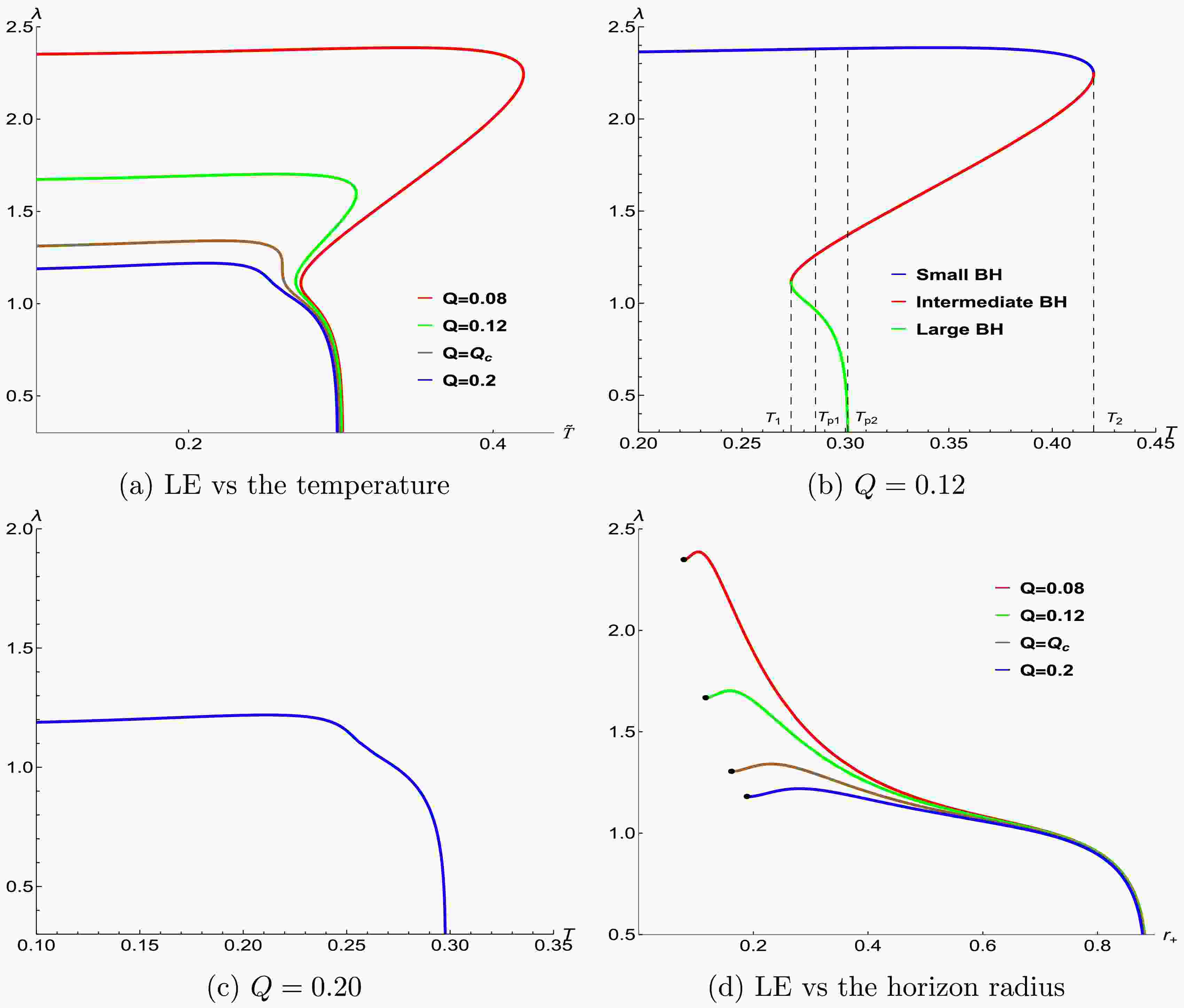 Figure 9 reveals the relationship between the LE characterized chaos for the charged particle and the horizon radius. In Figure 9(a), as the particle's angular momentum increases, the violation region of the chaos bound also expands. It is noteworthy that, similar to Figure 8(a), the violation occurs solely in the spacetime of the stable small BH phase, and the violation region always remains below the critical value
