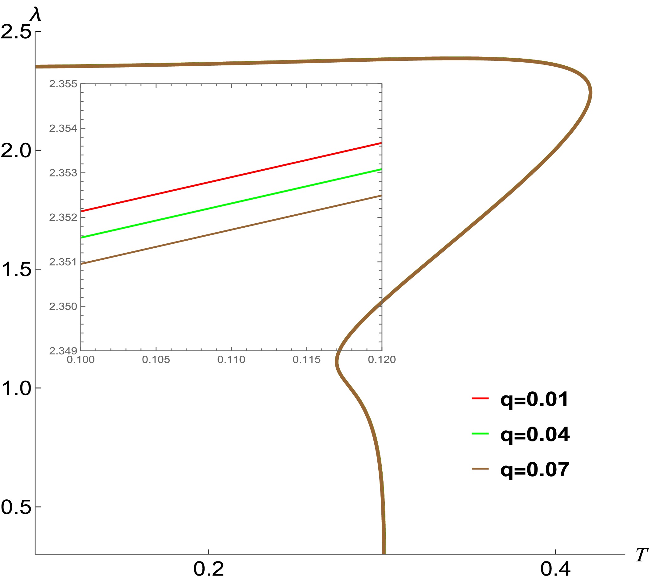 As demonstrated in [46–51], the LEs exhibit remarkable capability in revealing the thermodynamic phase transitions of BHs in AdS spacetimes. Building on this foundation, we first explore the correlation between the exponent of chaos for the massless particle and the phase transition of the NLED BH, and draw Figure 5.