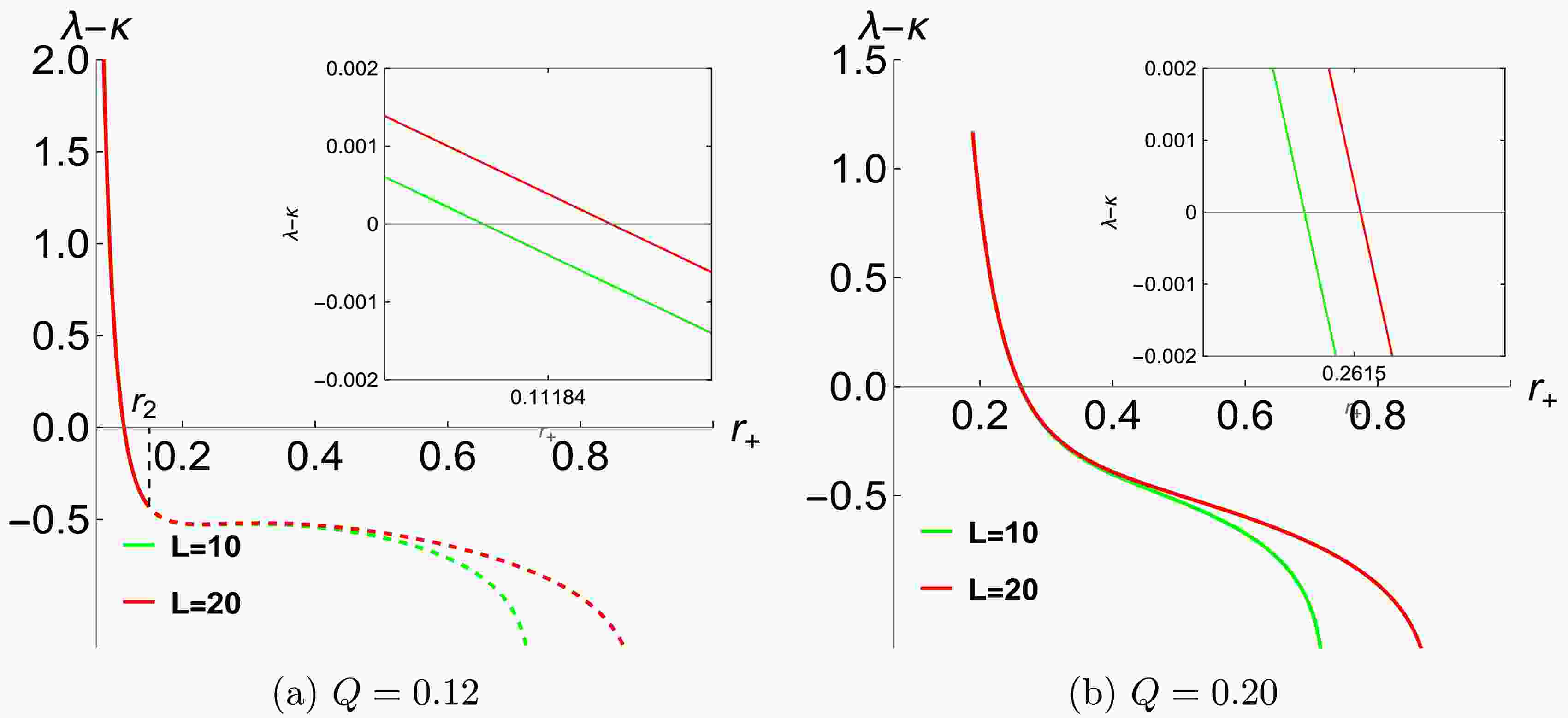 $ \frac{2\pi T}{\hbar} $ ) of the NLED BH, considering both the massless (Figure 8) and charged (Figure 9) particles, respectively. It is important to emphasize that:$ {r}_2 $ in subfigures 8(a) and 9(a) denotes a critical radius at which the BH undergoes a phase transition from the small BH phase to the non-small BH phase, and this corresponds to the temperature$ T_2 $ depicted in Figure 6(b). The left hand side of$ {r}_{2} $ represents the stable branch of small BHs.$ \lambda-\kappa>0 $ indicate a violation of the chaos bound. Figure 8 elucidates the relationship between the LE characterized chaos for the massless particle and the horizon radius. As can be discerned from the figure, when the radius is less than$ {r}_2 $ , a violation of the chaos bound occurs, indicating that the violation manifests in the spacetime of the stable small BH phase. Figure 8(b) illustrates the scenario where$ Q=0.2>Q_c $ . In this case, the NLED BH does not undergo a phase transition, yet we still observe a violation of the chaos bound. Moreover, by comparing it with Figure 8(a), we find that an increase in the BH's charge enlarges the threshold radius corresponding to the occurrence of the violation.