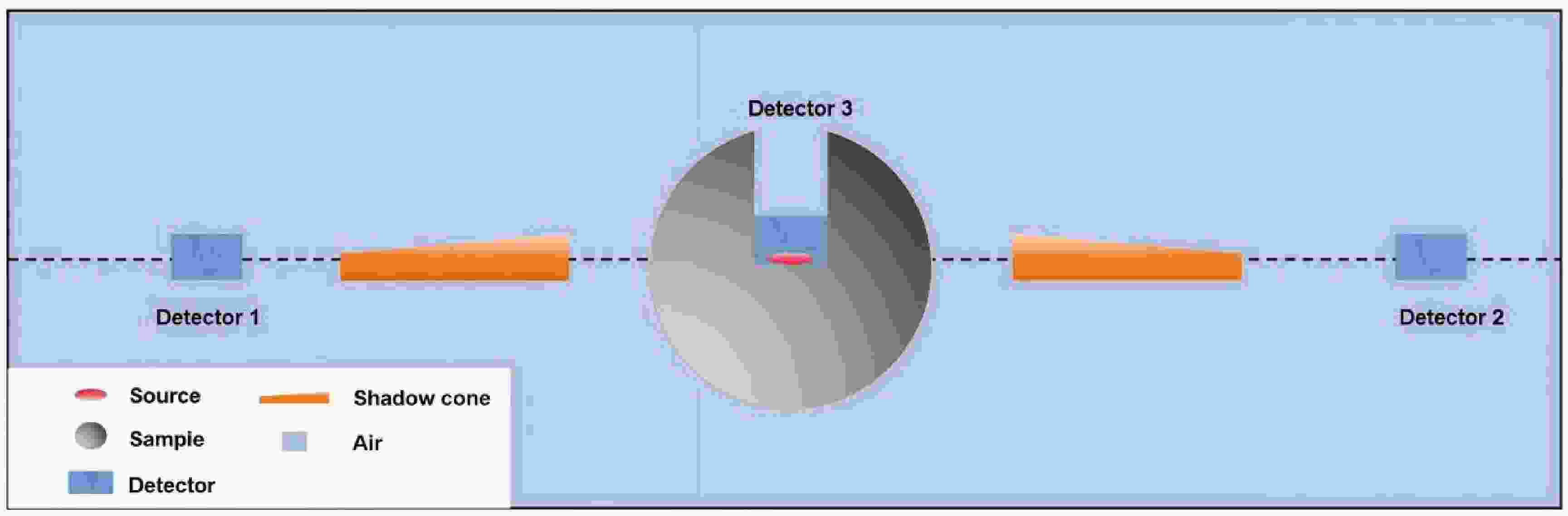 Based on the laboratory layout shown in Fig.2 (sample-in configuration), a comprehensive geometry model was developed to include all relevant structures and components. The detector efficiency was input using the simulation-based calibration curves verified by experimental data, . Given that the 252Cf neutron source used in the experiment was thin, it was modeled as a surface source. The dimensions and material composition of the neutron source backing were also accurately defined.