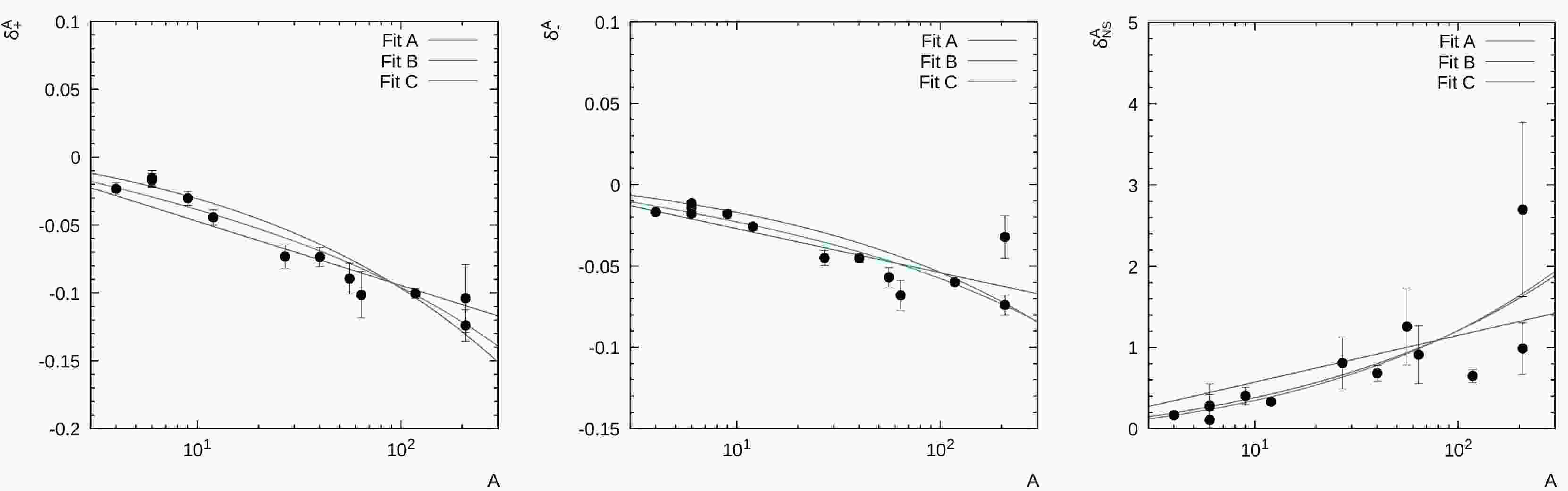 $ i = \pm $ or NS, and we note that$ \delta^A_\pm $ and$ \delta^A_{NS} $ have to be zero at$ A = 1 $ . Hereafter, the parameterizations in Eqs. (26), (27), and (28) are referred to as Fit A, Fit B, and Fit C, respectively. Based on the data from Table 1, we determine all parameters involved in the fits and list them in Table 2. The fitted nuclear dependence of$ \delta^A_\pm $ and$ \delta^A_{NS} $ is shown in Fig. 1. As can be seen from the Table 2 and Fig. 1, large uncertainties in the experimental data do not allow us to choose which of the parameterizations in Eqs. (26)−(28) is better. Thus, in accordance with the inaccuracies of the experimental data, each case from Eqs. (26)−(28) can be used for applications.$ a_+ $ $ a_- $ $ a_{NS} $ $ b_+ $ $ b_- $ $ b_{NS} $ Fit A $ -0.027 \pm 0.001 $ $ -0.015 \pm 0.002 $ $ 0.33 \pm 0.04 $ Fit B $ -0.021 \pm 0.001 $ $ -0.012 \pm 0.001 $ $ 0.25 \pm 0.04 $ Fit C $ -0.020 \pm 0.004 $ $ -0.012 \pm 0.002 $ $ 0.36 \pm 0.13 $ $ 0.029 \pm 0.015 $ $ 0.016 \pm 0.007 $ $ 0.12 \pm 0.54 $ Table 2. Parameters