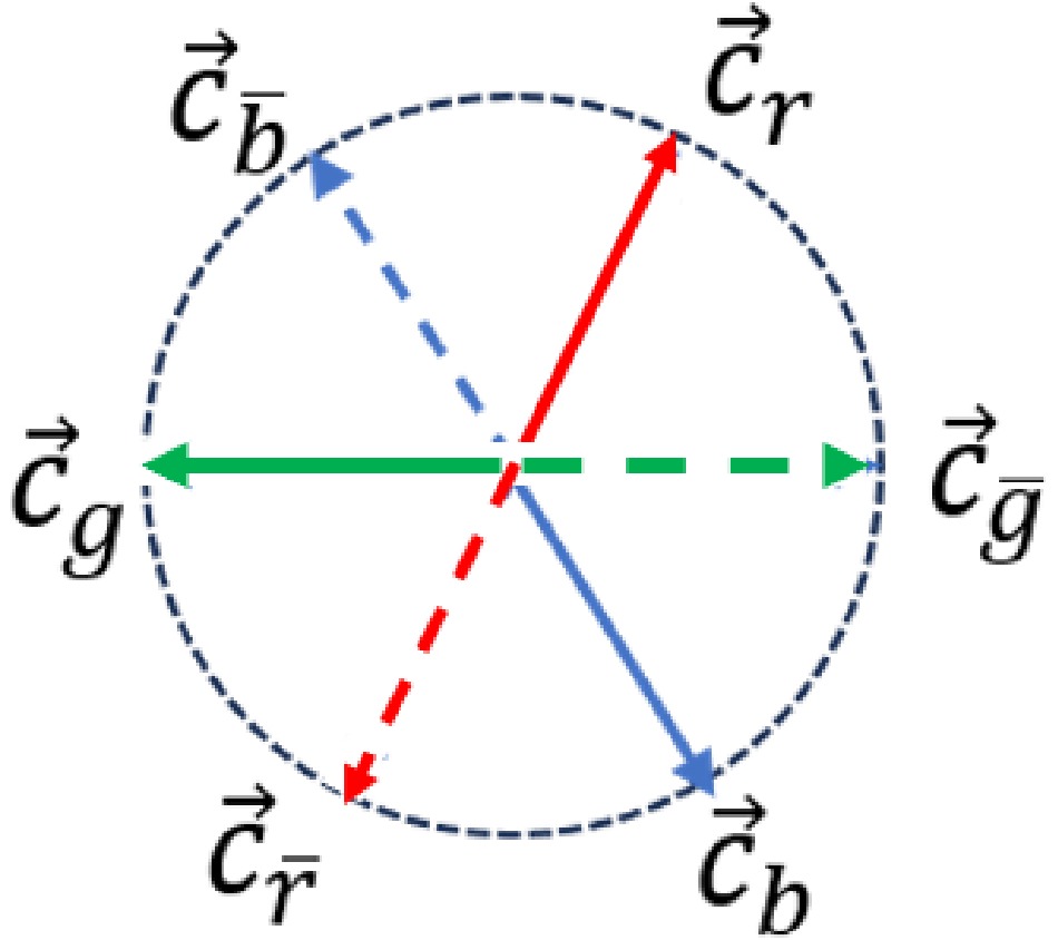 $ c_r,c_g,c_b $ and their corresponding anti-color charges$ c_{\bar{r}},c_{\bar{g}},c_{\bar{b}} $ as follows$ \begin{aligned}[b]& c_r \equiv {\rm e}^{\theta {\rm i}} , \;\; c_{\bar{r}}\equiv {\rm e}^{(\theta+\pi) {\rm i}}=-c_r; \\& c_g \equiv {\rm e}^{(\theta+\frac{2\pi}{3}){\rm i}}, \;\; c_{\bar{g}}\equiv {\rm e}^{(\theta-\frac{\pi}{3}){\rm i}}=-c_g; \\& c_b \equiv {\rm e}^{(\theta-\frac{2\pi}{3}){\rm i}}, \;\; c_{\bar{b}}\equiv {\rm e}^{(\theta+\frac{\pi}{3}){\rm i}}=-c_b; \end{aligned} $