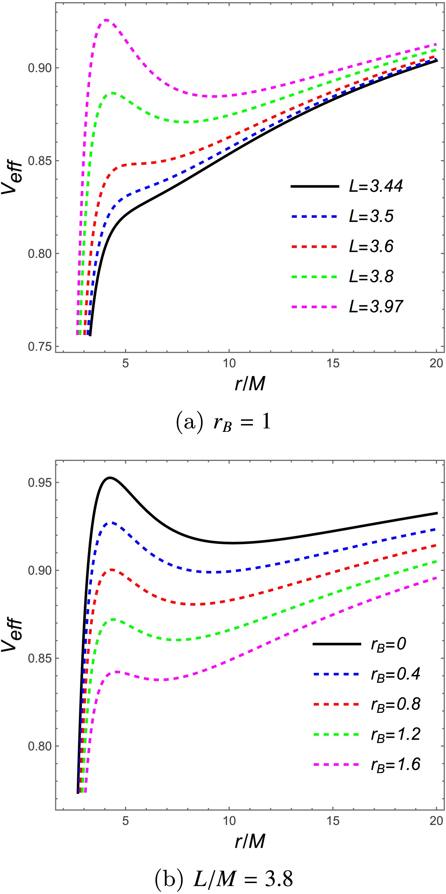 $ r_B $ . (1b) Behavior for varying$ r_B $ at constant angular momentum.The effective potential structure determines stable and unstable circular orbit locations, constraining allowed particle energies and angular momenta. For massive particles orbiting such black holes, bound trajectories exist between MBOs and ISCOs, with energy confined to