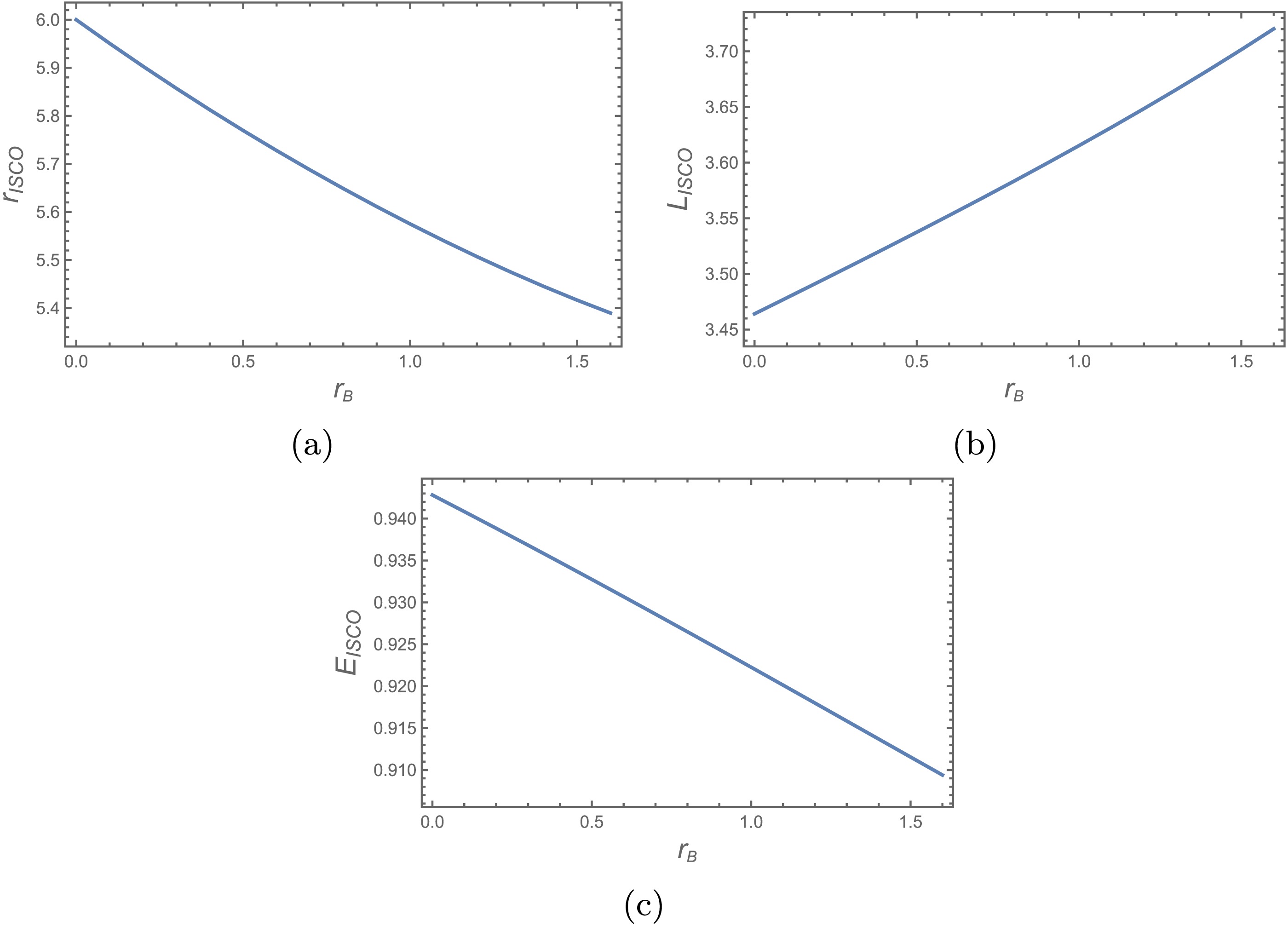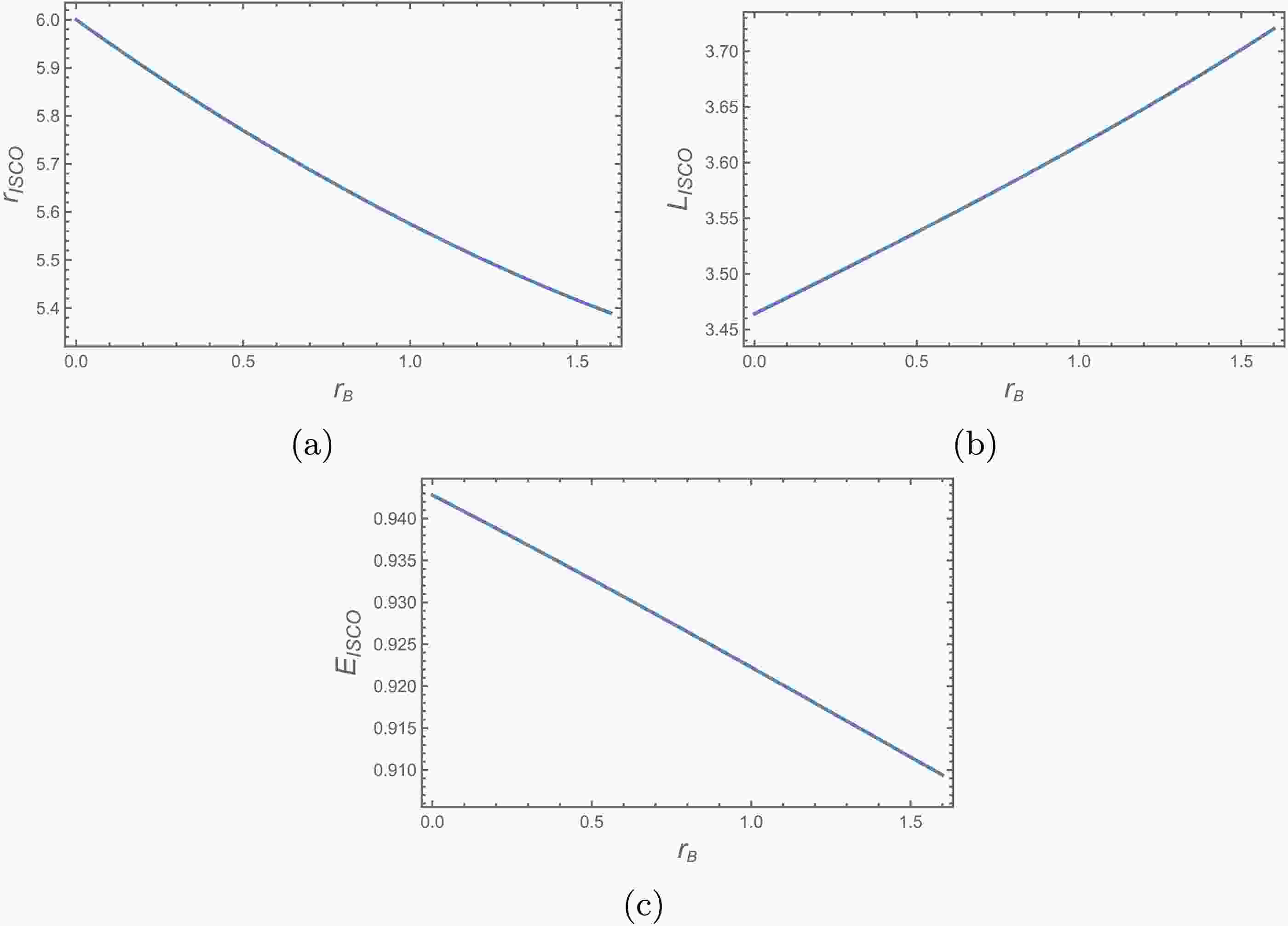 $ r_B $ . Numerical solutions yield ISCO radius, angular momentum, and energy variations with$ r_B $ , shown in Figure 3. ISCO radius and energy decrease with increasing$ r_B $ , while angular momentum increases, demonstrating scalar hair pushes ISCOs inward, reduces stability energy thresholds, but requires higher angular momentum for orbital stability.