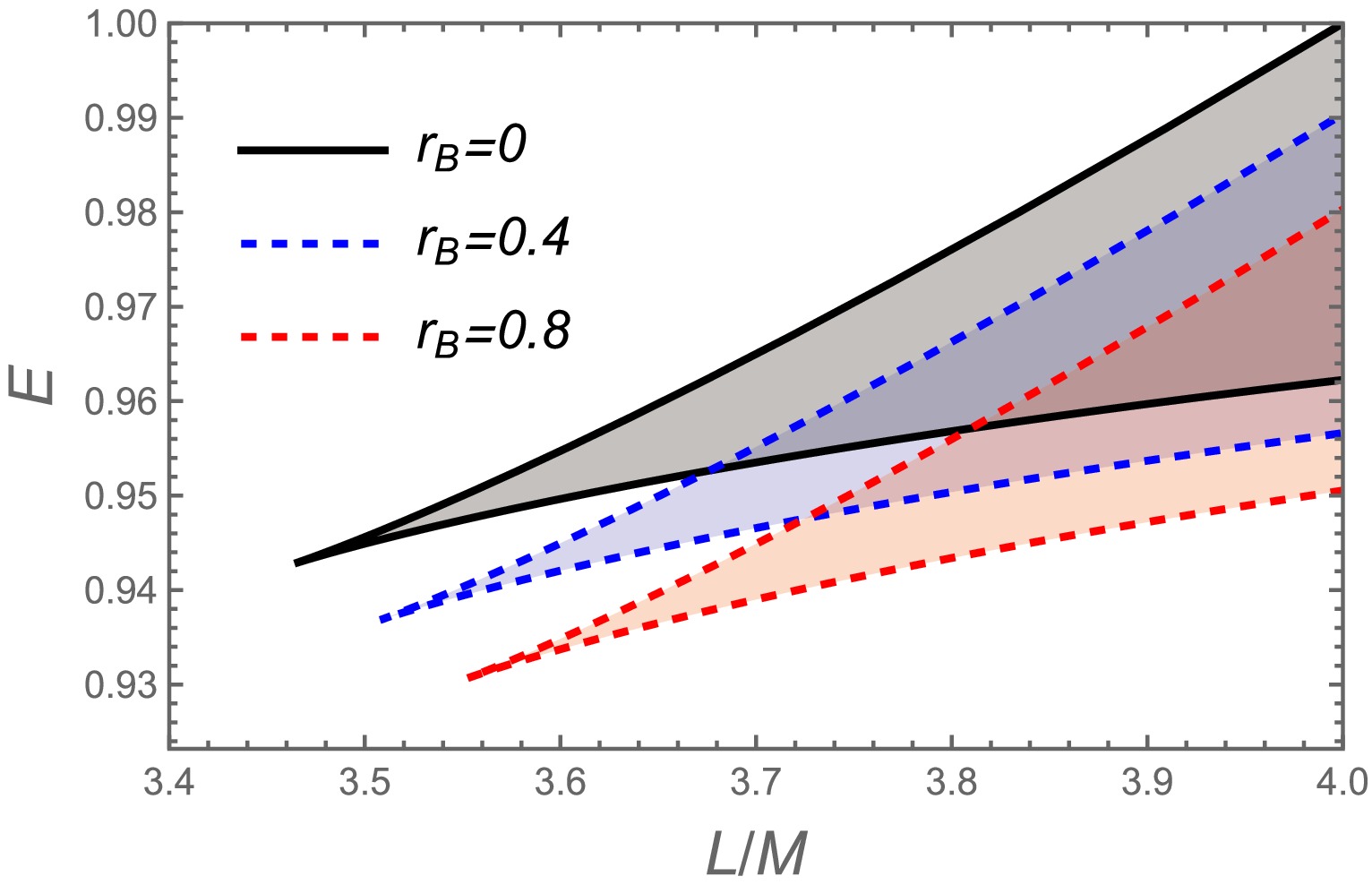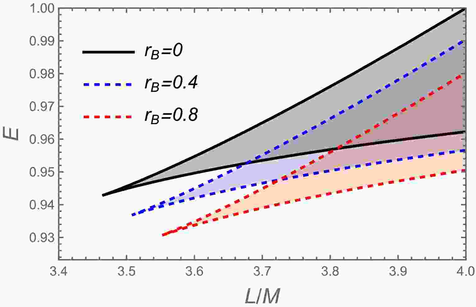 $ (E,L) $ plane from Eqs. (15) and (16). For fixed angular momentum, larger$ r_B $ values extend the upper energy boundary, reflecting scalar hair's enlargement of energetically allowed bound orbits, enriching orbital dynamics. -