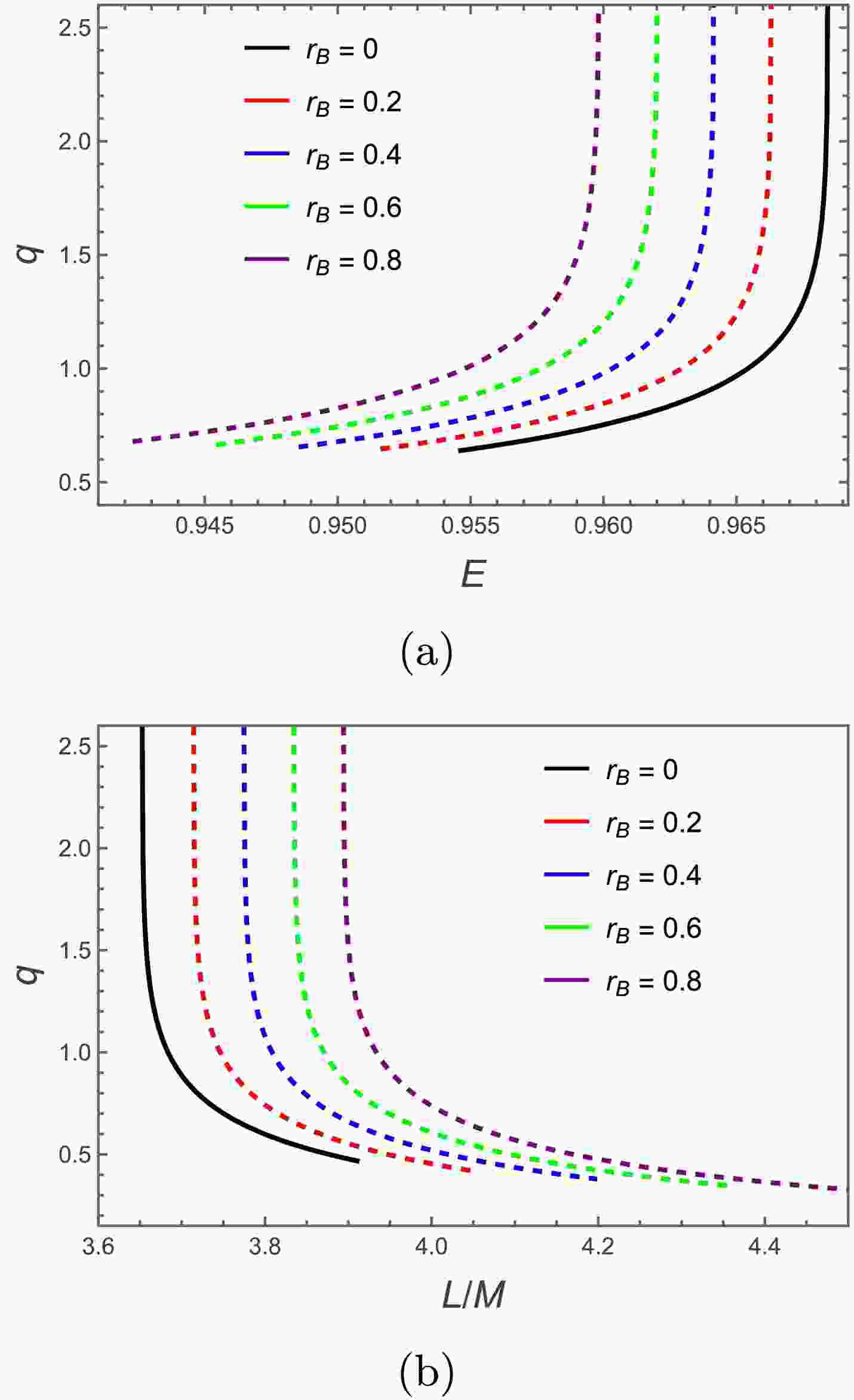 $ r_B $ , with fixed$ L=(L_{\text{MBO}}+L_{\text{ISCO}})/2 $ . (b) q versus angular momentum for different$ r_B $ , with fixed$ E=0.96 $ .Figure 5 shows q increases slowly with E initially but diverges as E approaches its maximum; versus L, q diverges near minimal L then gradually decreases. For fixed q, orbital energy E decreases while angular momentum L increases with