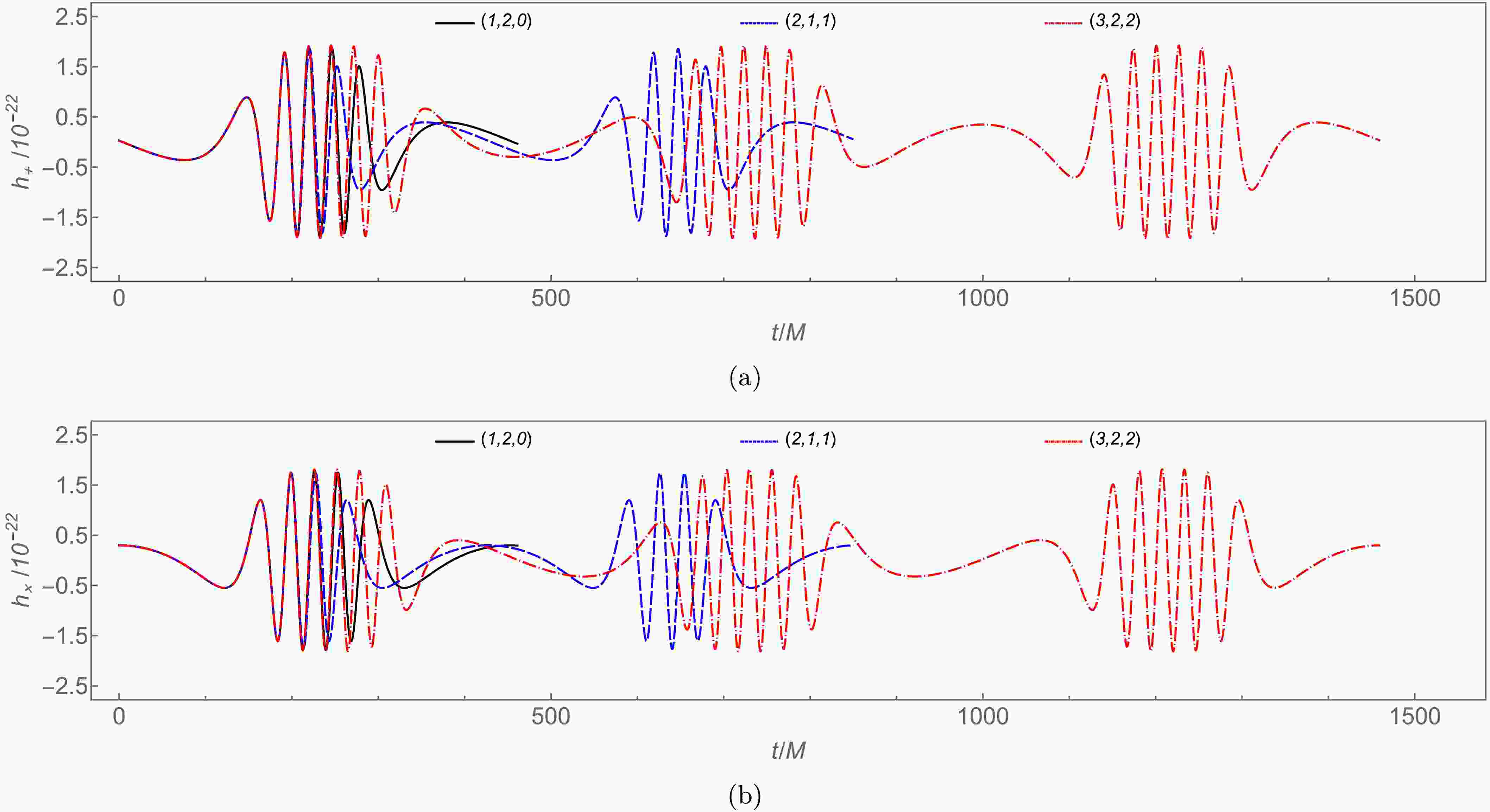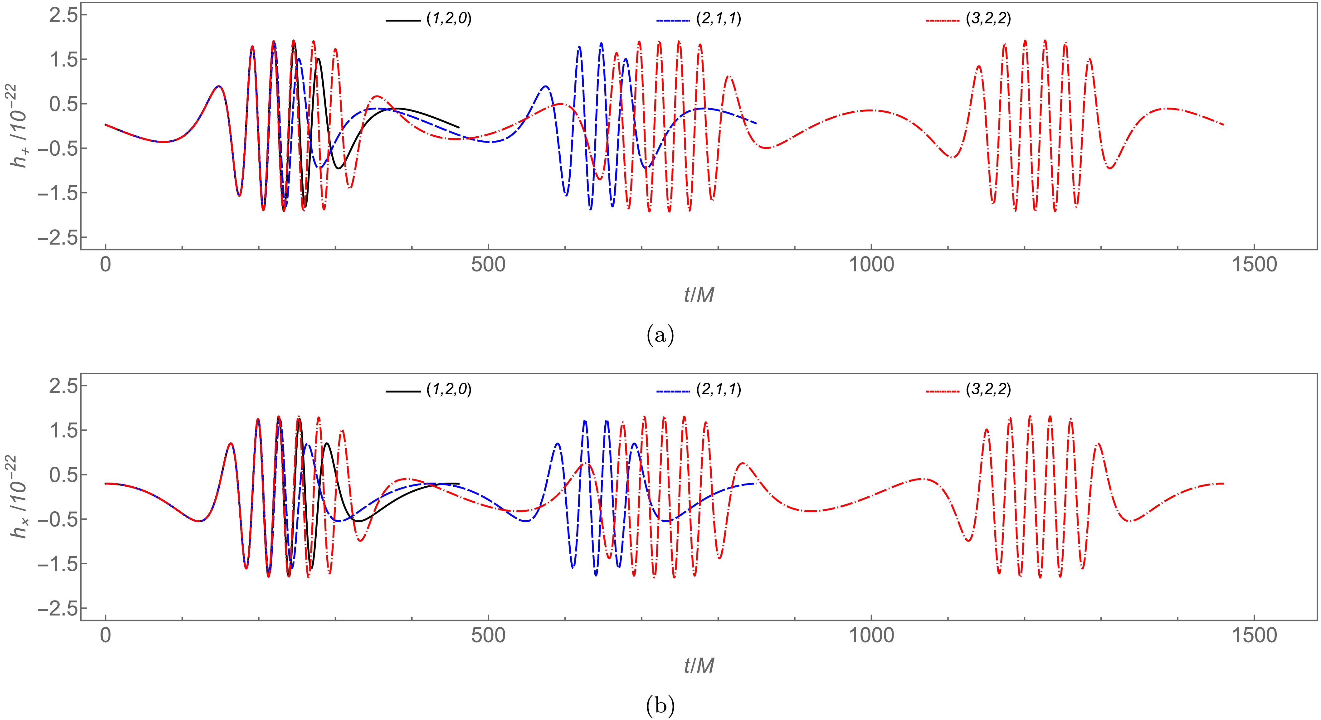 $ m=10M_\odot $ test objects on different periodic orbits around$ M=10^6M_\odot $ supermassive charged black holes with scalar hair, with fixed$ E=0.96 $ .Under identical setup, Figure 9 compares waveforms from fixed