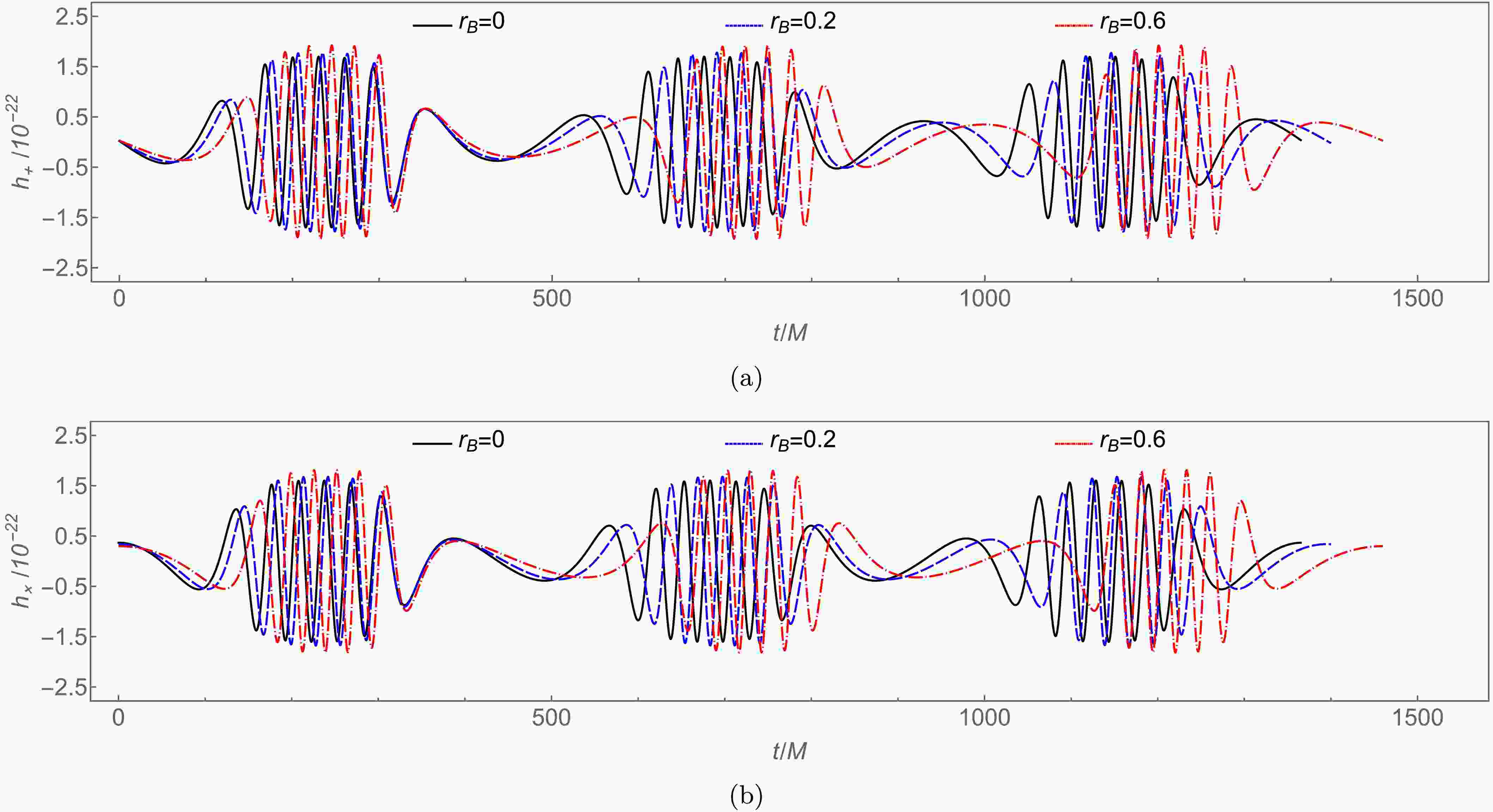$ r_B $ . Section IV studies the rational number q for periodic orbits and$ r_B $ 's effects on their energy and angular momentum. Section V presents gravitational waveforms from test objects on periodic orbits and their spectral properties. Conclusions and discussions appear in Section VI. Throughout, we use geometrized units with$ G = c = 1 $ . -