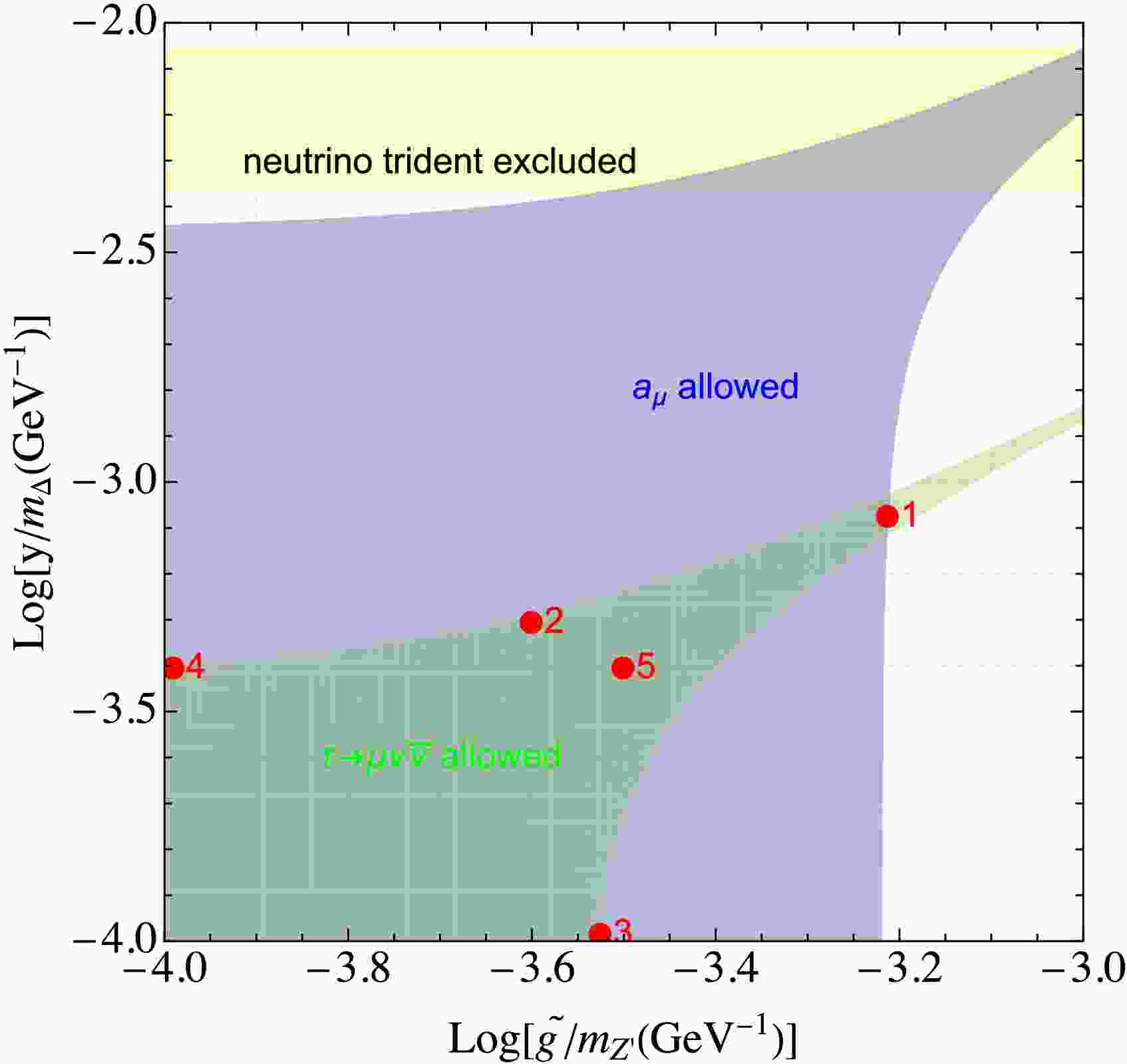 $ \tilde{g}/m_{Z^\prime}(10^{-3}\text{GeV}^{-1}) $ $ m_{Z^\prime}(\text{GeV}) $ $ \tilde{g} $ $ m_{\Delta}(\text{GeV}) $ $ Y_{22} $ $ \sigma\times10^{-4} $(pb) S/$ \sqrt{B+S} $