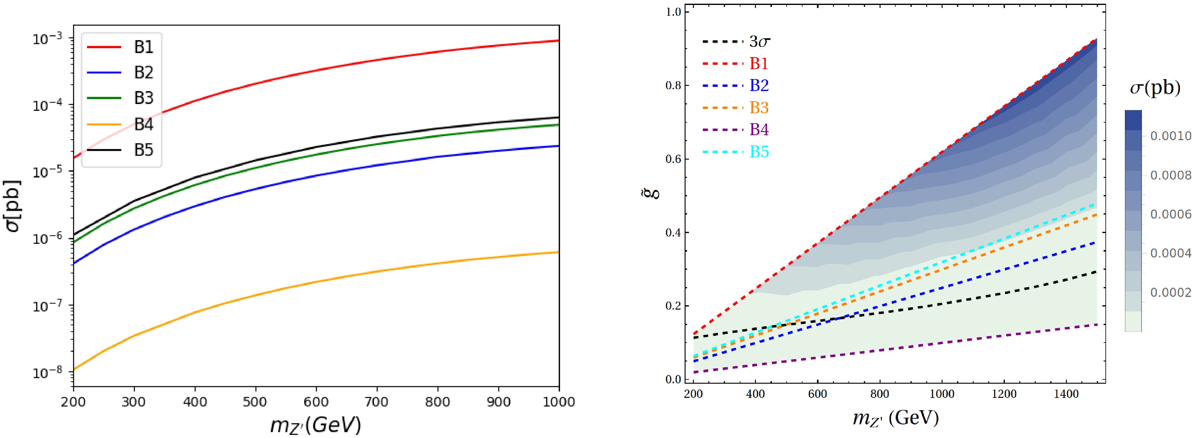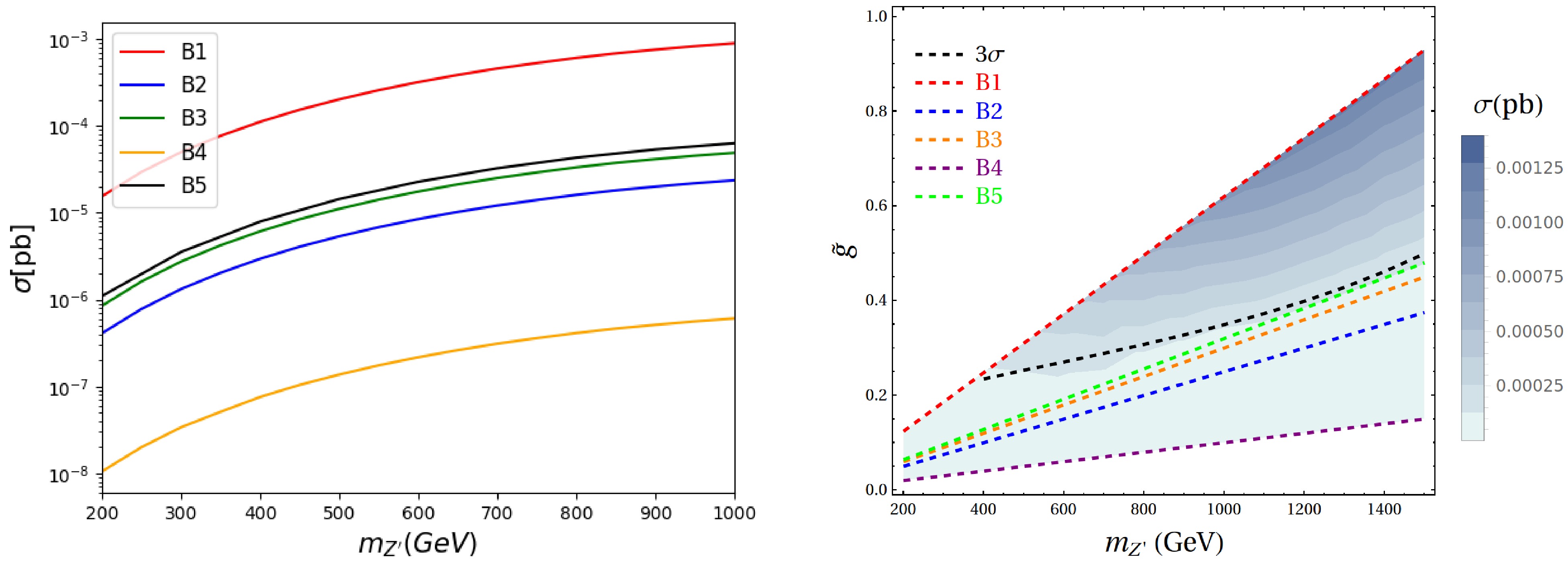 The corresponding cross section can be projected into the plane of $ \tilde g-m_{Z'} $ as shown in the right panel of Fig. 3. The shaded contours denotes the cross section as a function of the mass $ m_{Z'} $ and the coupling $ \tilde{g} $, with darker regions corresponding to larger signals. Benchmark points B1-B5 are indicated by distinct colored dashed lines, while the black dashed line marks the $ 3\sigma $ sensitivity threshold. Among the benchmarks, B1 lies mostly above the $ 3\sigma $ curve for $ m_{Z'}>400 $ GeV, indicating strong discovery prospects. In contrast, B2-B5 remain well below the observable threshold. Therefore, the $ Z' $ signal could be observable in the high-mass regime at a muon collider under scenario B1. Additionally, we further check that the contribution from the triplet scalar has only a minor effect on the overall cross section, suggesting that the gauge sector predominantly determines the collider sensitivity in this channel.
