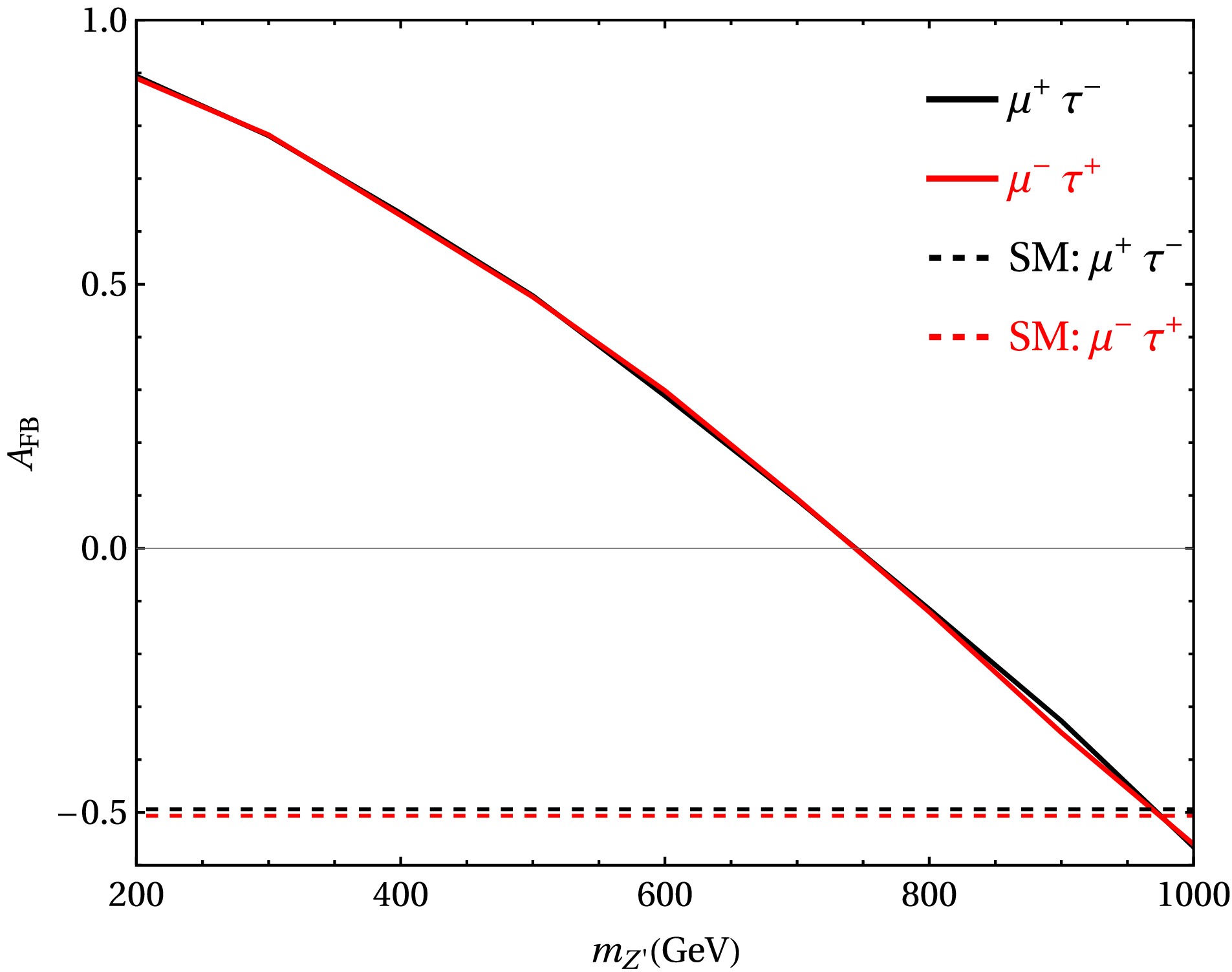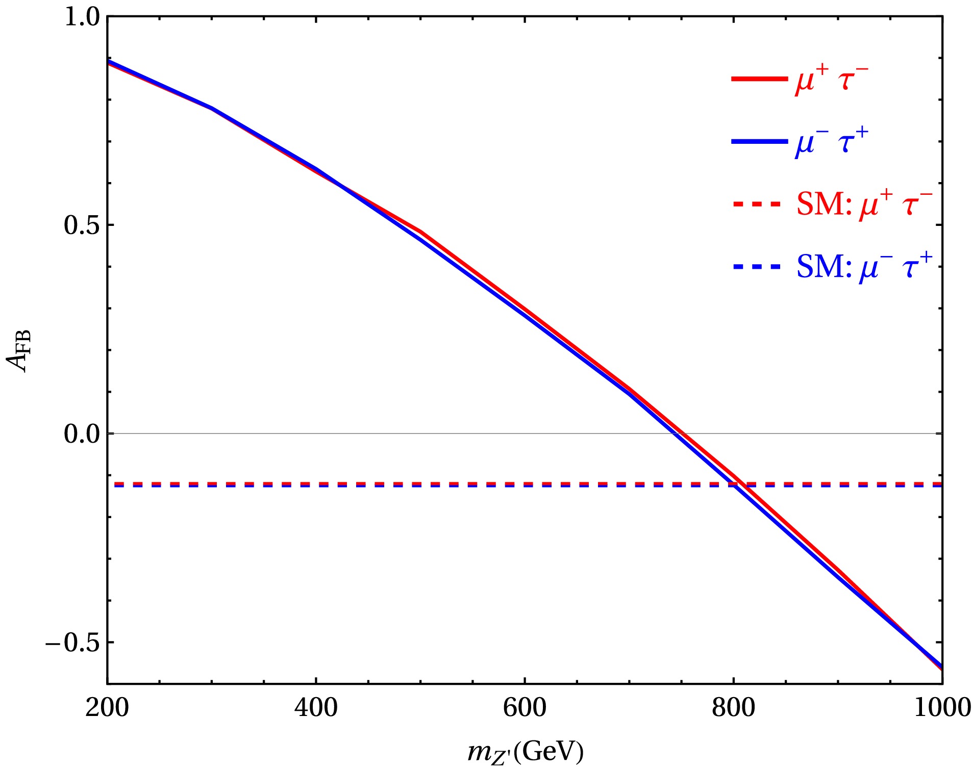 Figure 4.  (color online) Forward-backward asymmetry $A_{\rm FB}$ as a function of $ m_{Z^\prime} $ for $ \tilde{g}=0.1 $ with $ m_{\Delta}=500 $ GeV and $ Y_{22}=0.415 $.
