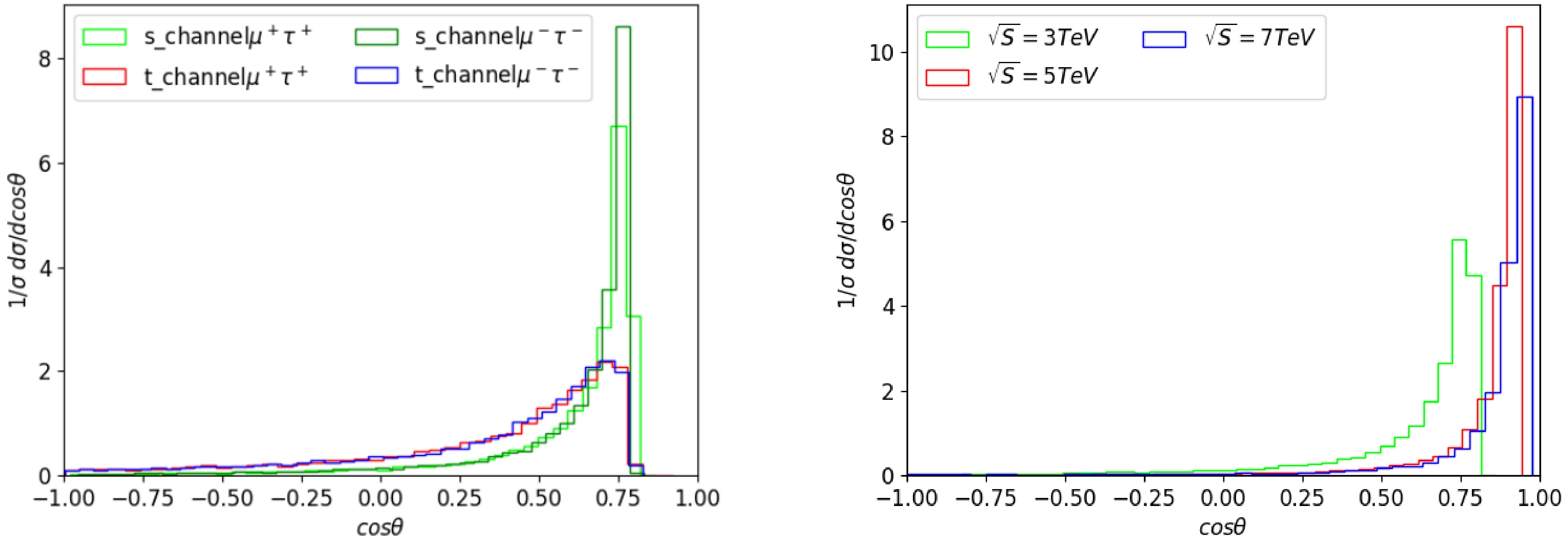 Here $ \sigma_{ij} $, where $ i,j=L,R $, denote the polarized cross sections, with “L” and “R” denoting 100% left- and right-handed polarization, respectively. A numerical evaluation yields $ {\cal{R}} \simeq -1 $, indicating a maximal left-right asymmetry (100%). This also serves as a cross-check of the interaction structure, where the left-handed vector current (V-A) is mediated by the triplet scalar. To further investigate the details, we similarly analyze the angular distribution of the differential cross section, as shown in Fig. 5. Here θ is defined as the angle between the two final-state charged leptons originating from the decay of the doubly charged Higgs boson. In the left panel, four different final-state configurations are presented, revealing that the angular distribution is truncated around $ \cos\theta = 0.8 $. This is because the difficulty in distinguishing the final-state μ and τ when the opening angle is small. The structure indicates that $ A_{FB} $ tends to be positive, with corresponding values of 0.8772, 0.6216, 0.8736, and 0.622, respectively. In the right panel, the angular distribution is shown for different collider energies, revealing that lower energies correspond to a larger truncation angle in the angular distribution. Additionally, when the center-of-mass energy reaches 6 TeV, the angular distribution becomes visible across the full range of $ \cos \theta\in [-1,1] $. Although the initial design stage plans to operate at a maximum energy of 3 TeV, a 10 TeV scenario is foreseeable in the future, provided that challenges such as muon beam cooling and the particle’s short lifetime are resolved.