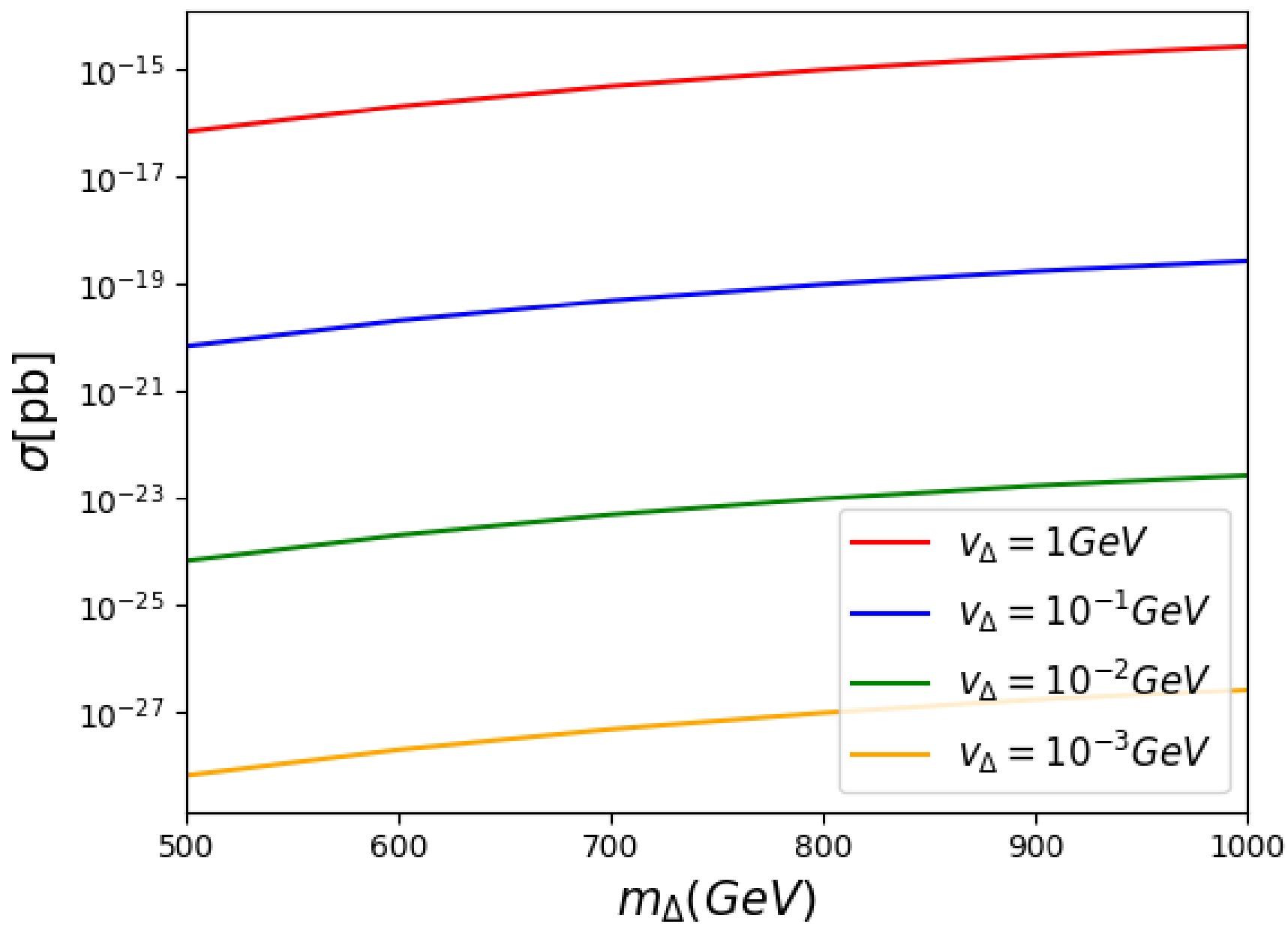where $ v_{\text{SM}}=246 $ GeV. We find that the decay into a pair of $ W^\pm $ primarily depends on the triplet VEV $ v_\Delta $, whereas the decay into charged leptons is predominantly governed by the Yukawa coupling. For the $ 4W $ boson final states originating from $ \Delta^{\pm\pm} $ decays, the production cross section with $ m_{\Delta} $ is presented in Fig. 6, which explicitly shows the significant role of $ v_\Delta $. Furthermore, the cross section exhibits a monotonic increase as $ m_{\Delta} $ increases. Additionally, the cross section decreases by several orders of magnitude when decreasing $ v_{\Delta} $ from 1 to $ 10^{-3} $ (corresponding to red and orange curves, respectively). This behavior is crucial for predicting detectability in collider experiments: higher values of $ v_{\Delta} $ and $ m_{\Delta} $ increase the cross section to levels potentially observable above background noise.