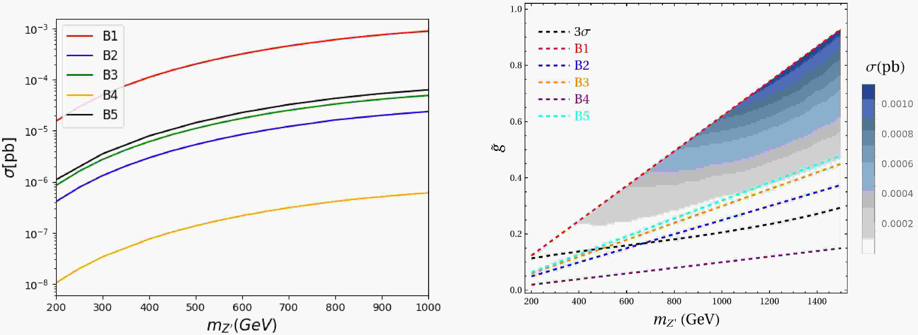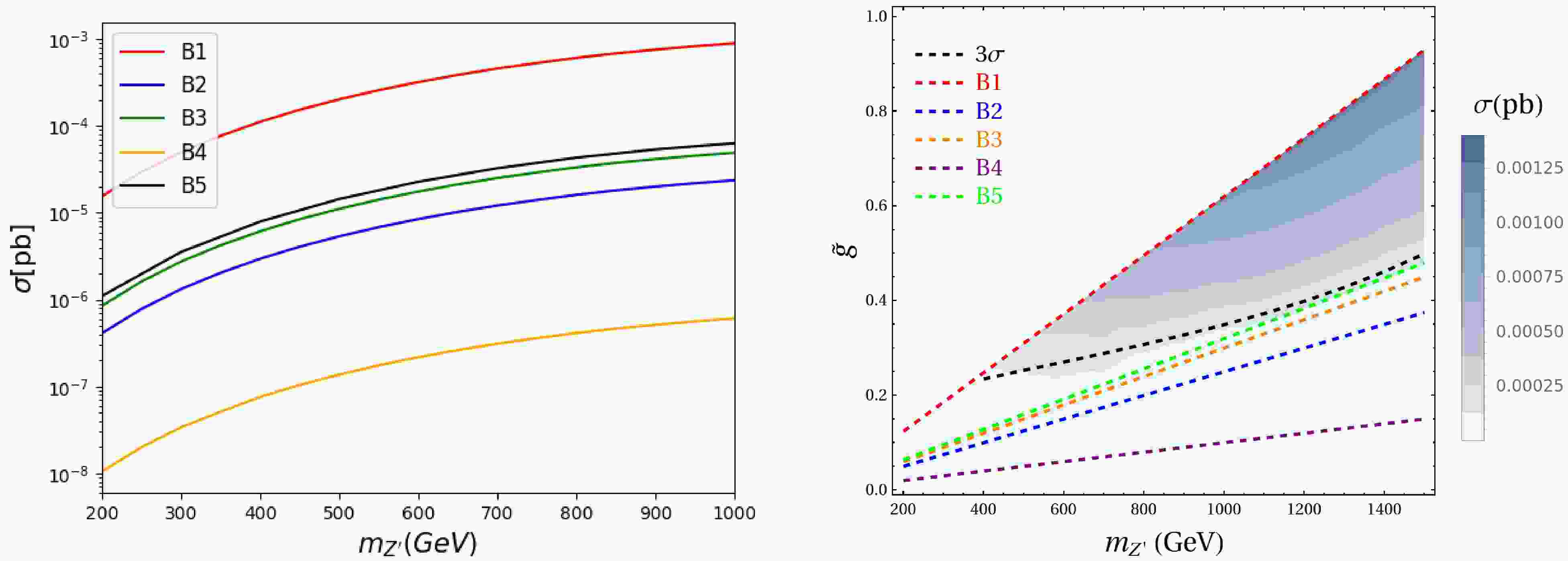$ \tilde g-m_{Z'} $ as shown in the right panel of Fig. 3. The shaded contours denotes the cross section as a function of the mass$ m_{Z'} $ and the coupling$ \tilde{g} $ , with darker regions corresponding to larger signals. Benchmark points B1-B5 are indicated by distinct colored dashed lines, while the black dashed line marks the$ 3\sigma $ sensitivity threshold. Among the benchmarks, B1 lies mostly above the$ 3\sigma $ curve for$ m_{Z'}>400 $ GeV, indicating strong discovery prospects. In contrast, B2-B5 remain well below the observable threshold. Therefore, the$ Z' $ signal could be observable in the high-mass regime at a muon collider under scenario B1. Additionally, we further check that the contribution from the triplet scalar has only a minor effect on the overall cross section, suggesting that the gauge sector predominantly determines the collider sensitivity in this channel.The above analysis is based on the unpolarized case. In practice, the initial-state lepton beams at a muon collider can be polarized in various configurations, as discussed in Refs. [67, 68]. In this study, we consider two representative polarization scenarios: