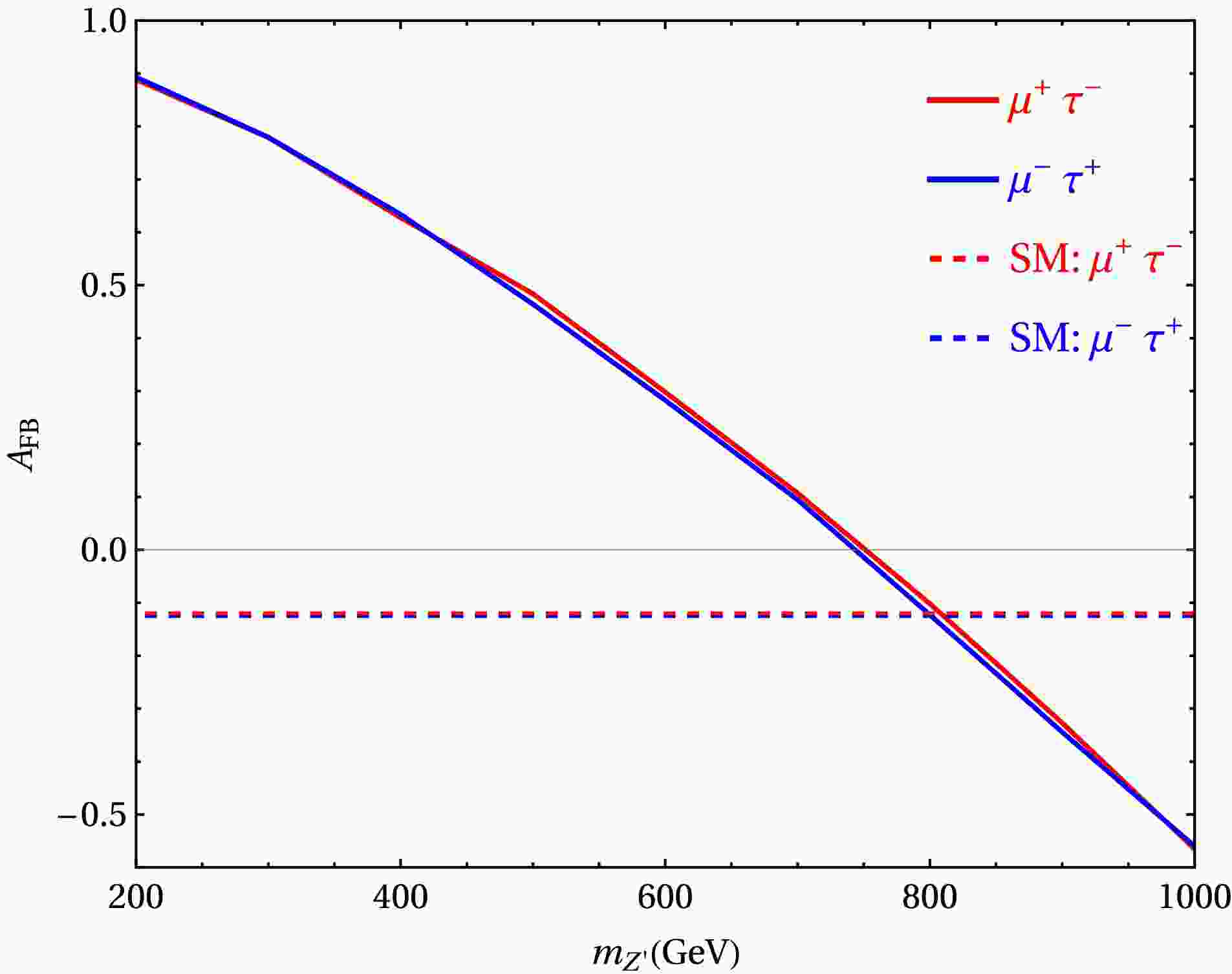 $ A_{\text{FB}} $ with respect to the mass$ m_{Z'} $ , considering the promising benchmark point B1 discussed earlier. By fixing the triplet scalar mass$ m_{\Delta}=500 $ GeV, we can isolate the pure impact of the$ Z^\prime $ mass on the asymmetry. Within the SM, the process$ \mu^{+}\mu^{-} \to \mu^{\pm}\mu^{\mp}\tau^{\pm}\tau^{\mp} $ is governed by γ/Z exchange and yields$ A_{FB}^{SM}\sim 0 $ , due to the absence of chiral flavor violating interference. For$ \tilde{g} = 0.1 $ , the allowed region in Fig. 1 corresponds to a$ m_{Z^\prime} $ range of 200-1000 GeV, As$ m_{Z^\prime} $ increases, the predicted forward-backward asymmetry$ A_{FB} $ decreases monotonically and approaches zero around$ m_{Z^\prime} \simeq 750 $ GeV, as illustrated in Fig. 4 This monotonic decrease reflects the suppression of parity-violating interference effects as the$ Z^\prime $ becomes heavier. Notably, the transition from positive to negative asymmetry is a characteristic feature of the model and could serve as a discriminating observable in the search for heavy$ Z' $ bosons at future colliders. Furthermore, the two curves corresponding to the final states$ \mu^- \tau^+ $ (blue) and$ \mu^+ \tau^- $ (red) nearly overlap, corroborating the fact that the forward-backward asymmetry is largely insensitive to the electric charge assignment of the final-state leptons. Note that the behavior of the forward-backward asymmetry in our analysis is a direct consequence of the maximal flavor-violating$ Z' $ structure. The maximally flavor-violating scenario in our model arises from the discrete exchange symmetry,$ Z' \to -Z' $ and$ 1 \leftrightarrow 2 $ , which is guaranteed even at one-loop level due to the new charge assignment. This exchange symmetry may be broken by quantum corrections at higher loop levels, leading to small flavor-diagonal couplings to muons and taus. However, the resulting flavor-diagonal couplings$ \tilde g_{\mu\mu} $ are much smaller than the flavor-changing couplings$ \tilde g_{\mu\tau} $ , so that the dominant contribution to$ A_{FB} $ comes from the flavor-changing couplings, and the corresponding results remain largely unaffected.