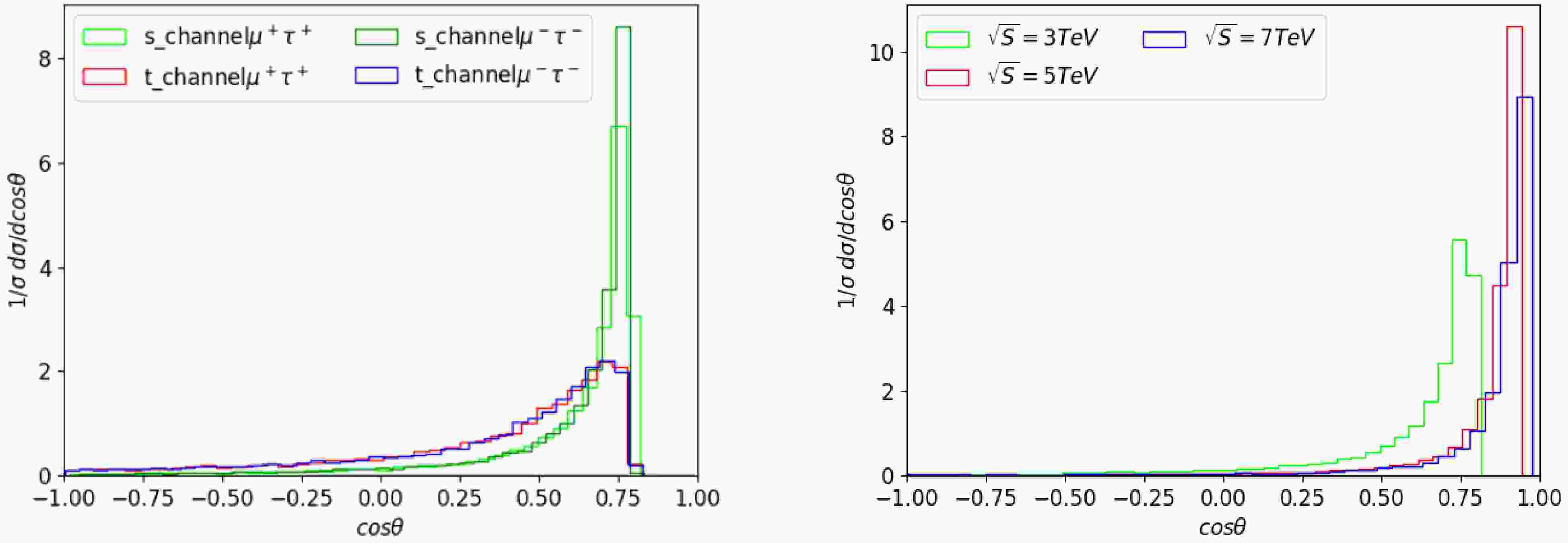 $ \sigma_{ij} $ , where$ i,j=L,R $ , denote the polarized cross sections, with “L” and “R” denoting 100% left- and right-handed polarization, respectively. A numerical evaluation yields$ {\cal{R}} \simeq -1 $ , indicating a maximal left-right asymmetry (100%). This also serves as a cross-check of the interaction structure, where the left-handed vector current (V-A) is mediated by the triplet scalar. To further investigate the details, we similarly analyze the angular distribution of the differential cross section, as shown in Fig. 5. Here θ is defined as the angle between the two final-state charged leptons originating from the decay of the doubly charged Higgs boson. In the left panel, four different final-state configurations are presented, revealing that the angular distribution is truncated around$ \cos\theta = 0.8 $ . This is because the difficulty in distinguishing the final-state μ and τ when the opening angle is small. The structure indicates that$ A_{FB} $ tends to be positive, with corresponding values of 0.8772, 0.6216, 0.8736, and 0.622, respectively. In the right panel, the angular distribution is shown for different collider energies, revealing that lower energies correspond to a larger truncation angle in the angular distribution. Additionally, when the center-of-mass energy reaches 6 TeV, the angular distribution becomes visible across the full range of$ \cos \theta\in [-1,1] $ . Although the initial design stage plans to operate at a maximum energy of 3 TeV, a 10 TeV scenario is foreseeable in the future, provided that challenges such as muon beam cooling and the particle’s short lifetime are resolved.