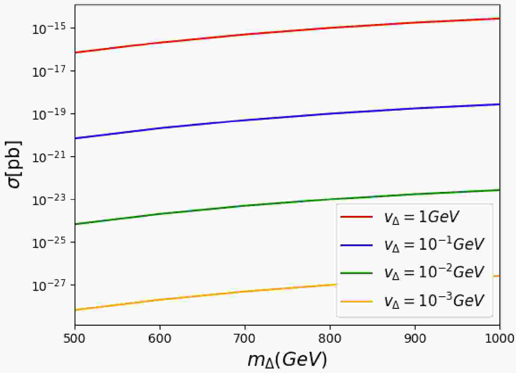 $ v_{\text{SM}}=246 $ GeV. We find that the decay into a pair of$ W^\pm $ primarily depends on the triplet vacuum expectation value$ v_\Delta $ , while the decay into charged leptons is predominantly governed by the Yukawa coupling. For the$ 4W $ boson final states originating from$ \Delta^{\pm\pm} $ decays, the production cross section with$ m_{\Delta} $ is presented in Fig. 6, which explicitly demonstrates the significant role of$ v_\Delta $ . Furthermore, the cross section exhibits a monotonic increase as$ m_{\Delta} $ increases. Additionally, the cross section decreases by several orders of magnitude when decreasing$ v_{\Delta} $ from 1 to$ 10^{-3} $ (corresponding to the red and orange curves, respectively). This behavior is crucial for predicting detectability in collider experiments: higher values of$ v_{\Delta} $ and$ m_{\Delta} $ increase the cross section to levels potentially observable above background noise. -