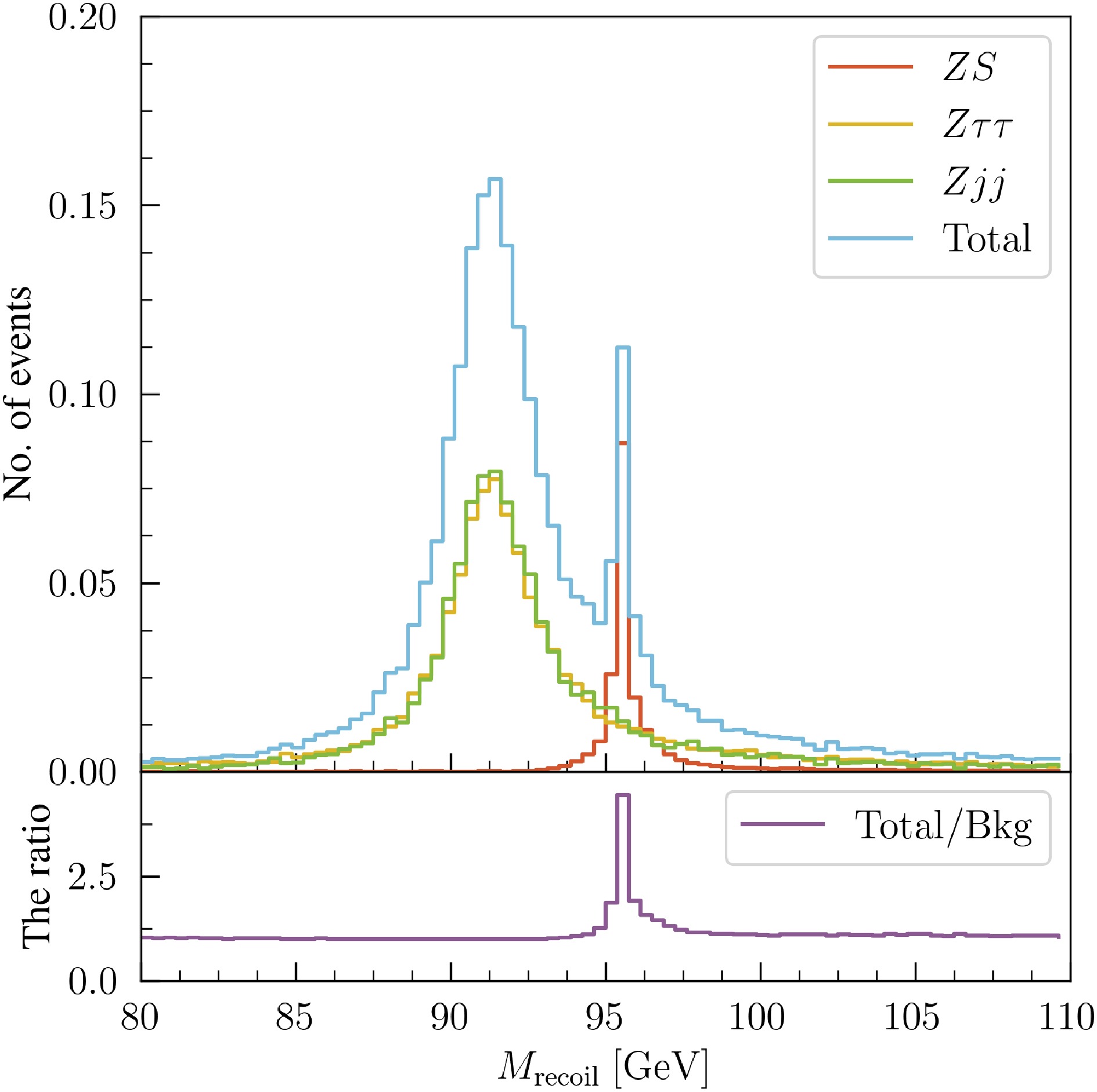 $ M_{\mathrm{recoil}} $ distributions for the signal$ ZS $ with$ M_S = 95.5 $ GeV, the backgrounds$ Z\tau\tau $ and$ Zjj $ , the total (signal + background), and the ratio of the total to the background. The number of signal events is normalized to 0.2, reflecting the assumption that the signal cross section is 20% of the Standard Model prediction, while the background event numbers are normalized to 1. The signal exhibits a pronounced peak around$ M_S $ , while both backgrounds show broader distributions peaking near 91 GeV, consistent with the Z mass. The total distribution is background-dominated across the mass range, as further reflected in the lower panel, where the ratio of the total to the backgrounds exhibits a localized peak near the signal mass.