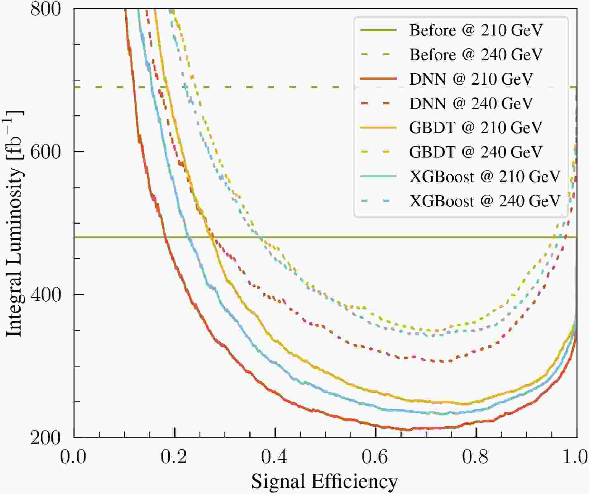 $ 5\sigma $ significance at the benchmark point, as a function of the signal efficiency. Solid (dotted) curves correspond to$ \sqrt{s} = 210\ (240) $ GeV. Colors denote different selection strategies: baseline (before applying ML classifiers, green), DNN (red), GBDT (yellow), and XGBoost (blue).$ \mathrm{TPR} = \frac{N_{\mathrm{TP}}}{N_{\mathrm{TP}}+N_{\mathrm{FN}}} , $