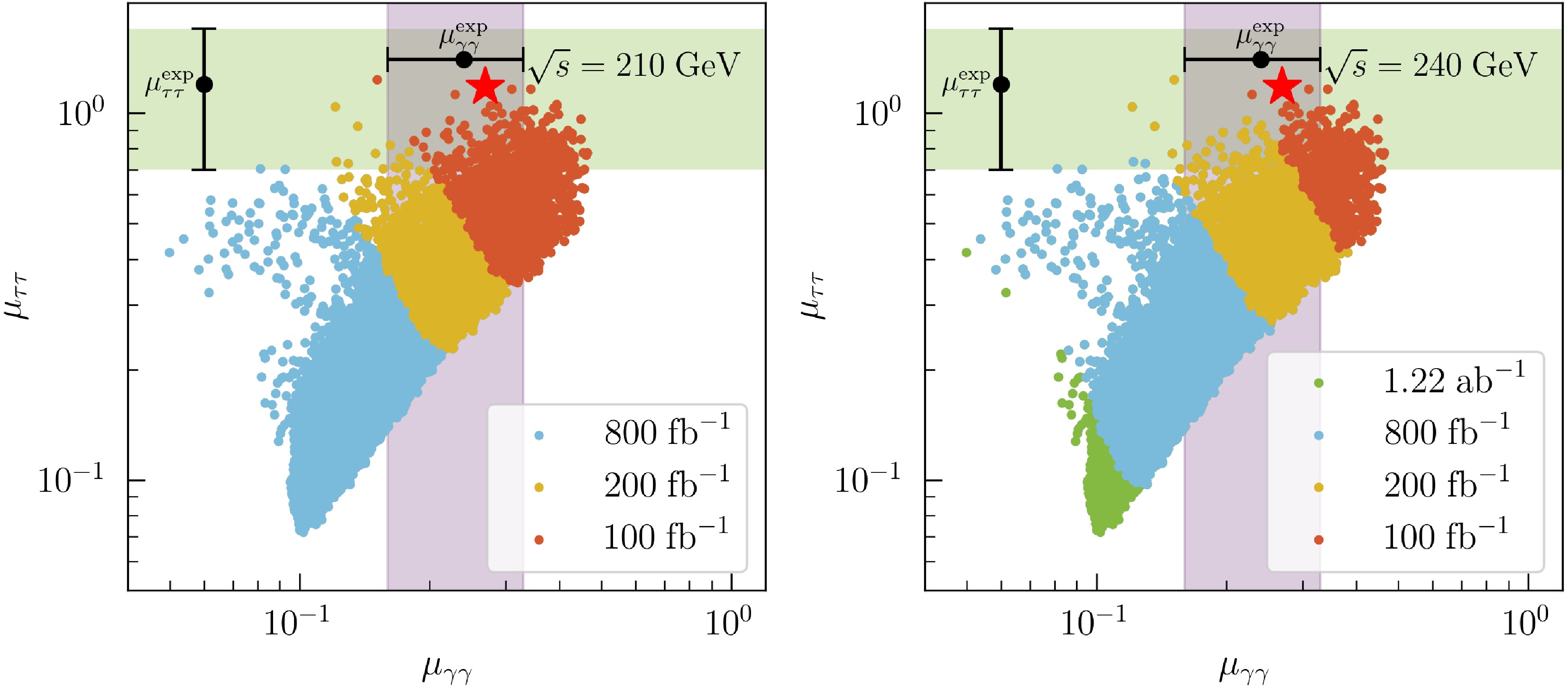 $ \mu_{\tau\tau} $ versus$ \mu_{\gamma\gamma} $ plane at$ \sqrt{s}=210 $ GeV (left panel) and$ \sqrt{s}=240 $ GeV (right panel). CEPC with$ L=100,\; 200,\; 800 {\; {\rm{fb}}}^{-1},\; \mathrm{and}\; 1.22 {\; {\rm{ab}}}^{-1} $ can cover the red, yellow, blue, and green samples at the$ 5\sigma $ level, respectively. All the surviving samples can be covered at$ 5\sigma $ for$ \sqrt{s} = 210 $ GeV with$ L=800 {\; {\rm{fb}}}^{-1} $ and$ \sqrt{s} = 240 $ GeV with$ L=1.22 {\; {\rm{ab}}}^{-1} $ . The red star marks the best-fit point. The green and purple shaded bands indicate the experimental$ 1\sigma $ ranges for the$ \tau^+\tau^- $ and$ \gamma\gamma $ channels, respectively. -