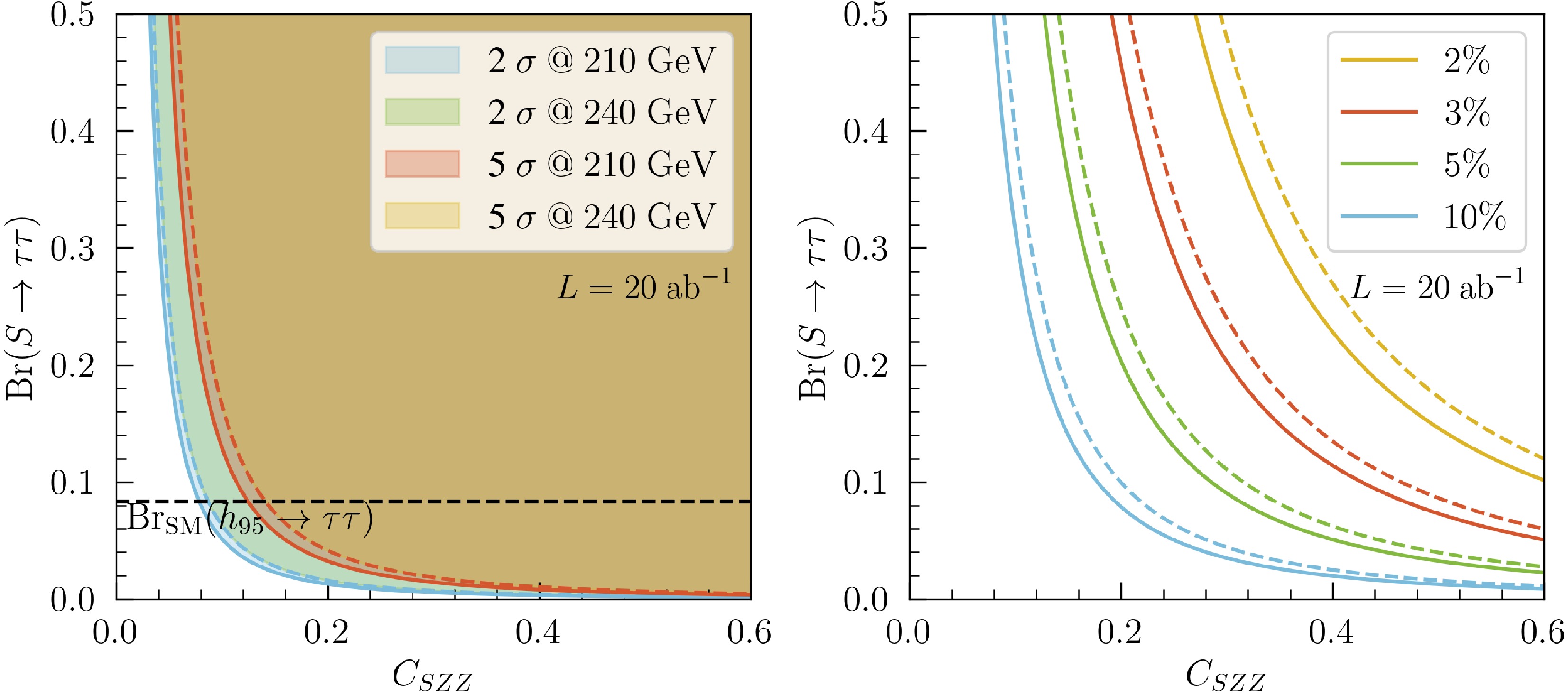 $ \mathrm{Br}(S\to\tau^+\tau^-) $ versus$ C_{SZZ} $ planes. The left panel shows the expected$ 2\sigma $ and$ 5\sigma $ coverage, and the right panel shows the relative statistical precision on the signal yield. Results are presented for$ \sqrt{s}=210 $ GeV (solid) and$ \sqrt{s}=240 $ GeV (dashed), assuming an integrated luminosity of$ L=20\; \mathrm{ab}^{-1} $ .$ \delta_{\rm stat}=\frac{\sqrt{(\mathcal S+\mathcal B)L}}{\mathcal S L}, $