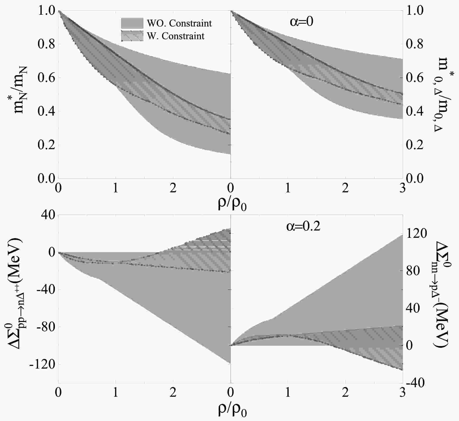 $ m^*_{N}/m_{N} $ ) and effective pole masses of ∆ ($ m^*_{0,\Delta}/m_{0,\Delta} $ ) in symmetric nuclear matter as functions of$ \rho/\rho_0 $ . The lower panels display the changes in vector self-energies$ \Delta \Sigma^{0}{pp \to n\Delta^{++}} $ and$ \Delta \Sigma^{0}{nn \to p\Delta^{-}} $ in asymmetric nuclear matter with$ \alpha = 0.2 $ . The pure gray areas represent the ranges of all considered RMF models, and the hatched areas indicate the subset constrained by neutron star observations. The constrained shaded band denotes the model-ensemble envelope—range from minimal to maximal values across all RMF interactions that pass the neutron-star filters—and is not a statistical confidence interval.Because the most RMF models are adjusted to describe the nuclei and nuclear matter in the density region from near subsaturation density
