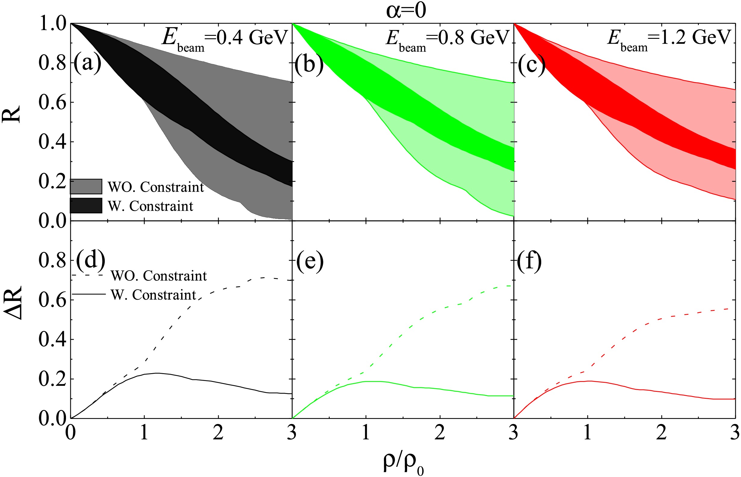 $\Delta R = R_{\max} - R_{\min}$ (bottom panels) as a function of$\rho/\rho_0$ for beam energies$E_{\mathrm{beam}} = 0.4, 0.8,$ and$1.2$ GeV in symmetric nuclear matter. The unconstrained$\Delta R$ increases with density, but once constraints are applied to the in-medium cross sections, the spread in R is notably reduced compared to the unconstrained results. For instance, at$E_{\mathrm{beam}} = 0.4$ GeV,$\Delta R$ decreases from$0.283$ to$0.219$ at$\rho_0$ , from$0.648$ to$0.182$ at$2\rho_0$ , and from$0.696$ to$0.125$ at$3\rho_0$ . This reduction stems from the decreased uncertainty in effective masses (see Fig. 1).