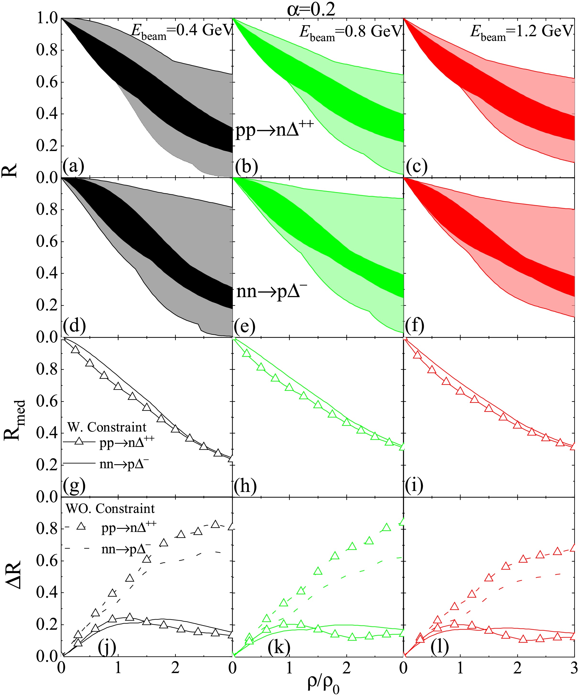 $pp\to n\Delta^{++}$ and$nn\to p \Delta^{-}$ channels as examples to illustrate the in-medium cross sections in asymmetric nuclear matter. In Fig. 4, we plot R for$pp\to n\Delta^{++}$ (panels (a), (b), (c)) and$nn\to p \Delta^{-}$ (panels (d), (e), (f)), the constrained median values$R_{\mathrm{med}}$ (panels (g), (h), (i)), and the range$\Delta R$ (panels (j), (k), (l)) as functions of$\rho/\rho_0$ in asymmetric nuclear matter with$\alpha=0.2$ for$E_{\mathrm{beam}}=0.4$ , 0.8, and 1.2 GeV.