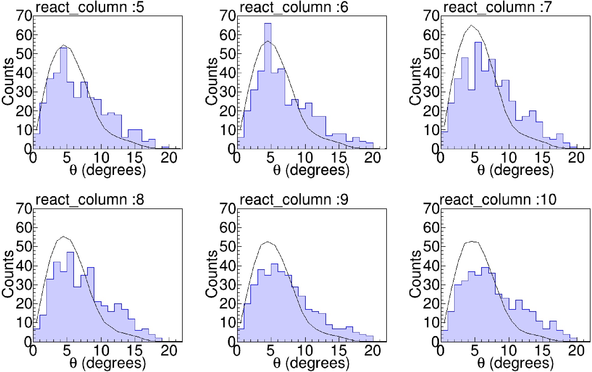 $dE(i)$ represents the energy loss in the$i-{\rm{th}}$ column. The recorded events were classified into two categories, reacted events and un-reacted events, based on the condition$dE(i) > 1.3 \, dE(i-1)$ , with i ranging from 1 to 31. The location of the i-th column was then identified as the reaction position, and the i-th column was labeled as the react_column in this paper. An example of the reaction vertex determination is shown in Fig. 4. The exact 3D location of the reaction vertex was determined by the intersection of tracks of the beam particle and reaction products.