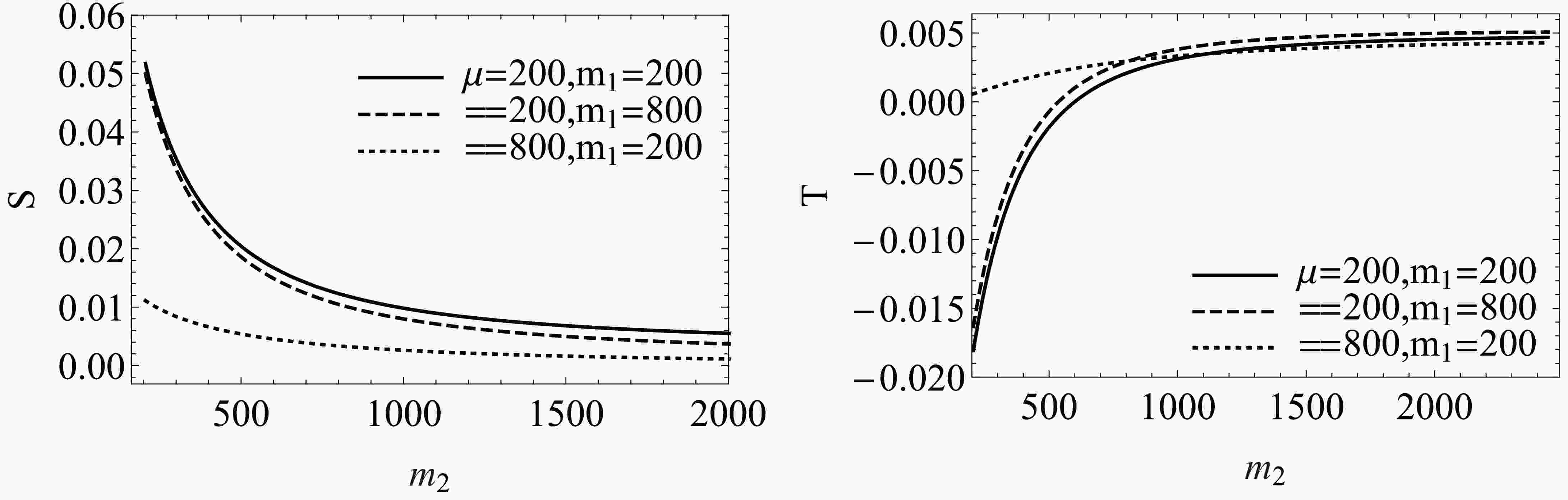 $ m_1 $ ,$ m_2 $ and μ in the$ (200\; \rm GeV\sim2000\; \rm GeV) $ ,$ (200\; \rm GeV\sim800\; \rm GeV) $ and$ (200\; \rm GeV\sim800\; \rm GeV) $ intervals respectively, we find that they are sensitive to the S and T parameters. The Fig. 3 shows that the S parameter gradually decreases with the increase of$ m_1 $ ,$ m_2 $ , and μ, while the T parameter shows an upward trend with the increase of$ m_1 $ and$ m_2 $ .$ m_1 $ and$ m_2 $ are the diagonal elements in the mass matrices of neutralinos and charginos, and their increase weakens the mixing of the matrices, which is the source of the contributions of oblique parameters.$ m_2 $ is the diagonal element with the highest value in the mass matrices of neutralinos and charginos, which explains its sensitivity to oblique parameters relative to$ m_1 $ .Fig. 4 illustrates the changes in the T and U parameters as the