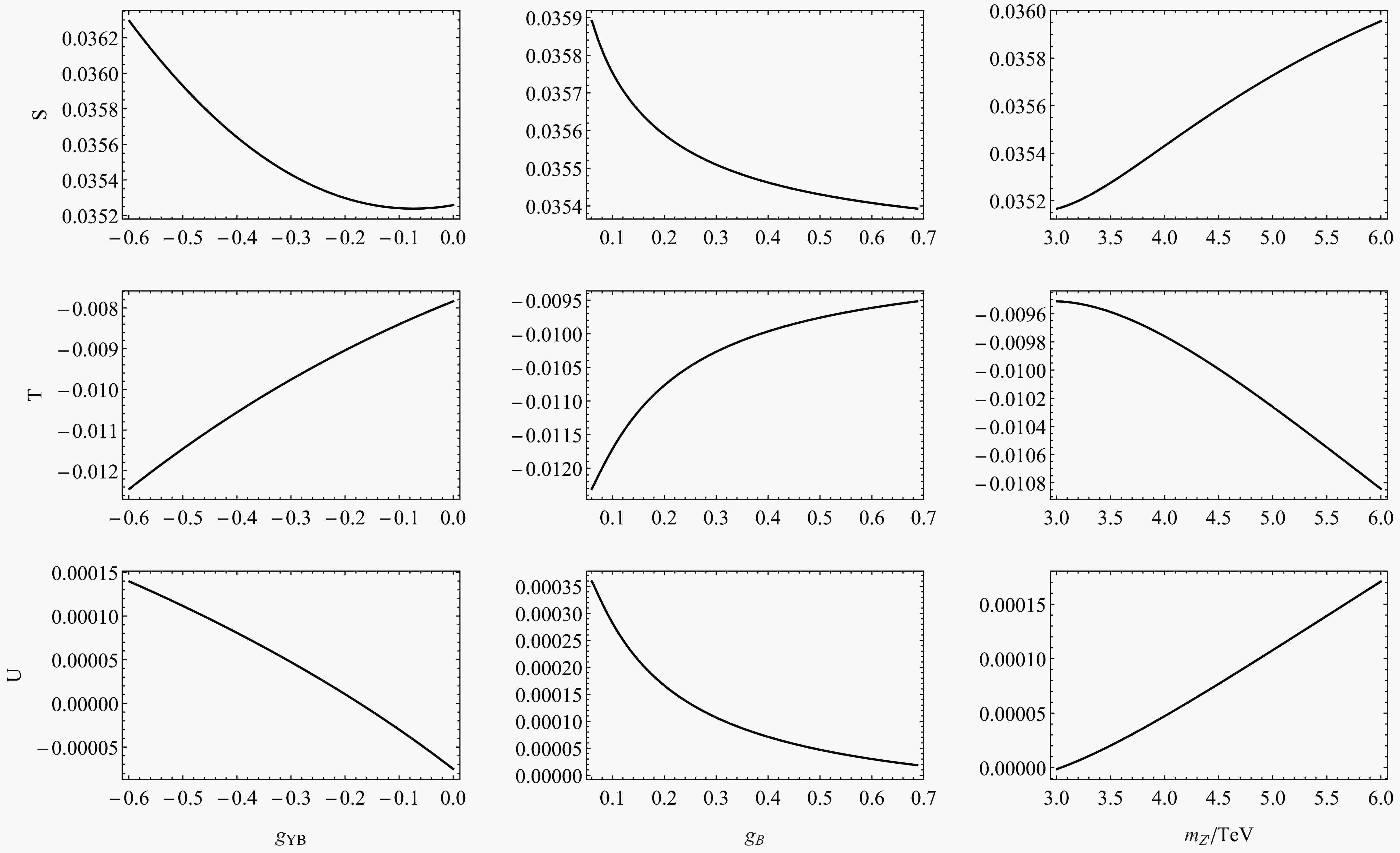 $ S, T $ , and U on the B-LSSM distinctive parameters$ g_{YB} $ ,$ g_B $ , and$ m_{Z'} $ . The SUSY-breaking parameters are fixed at the benchmark point.As shown in the panels of Fig. 5, varying