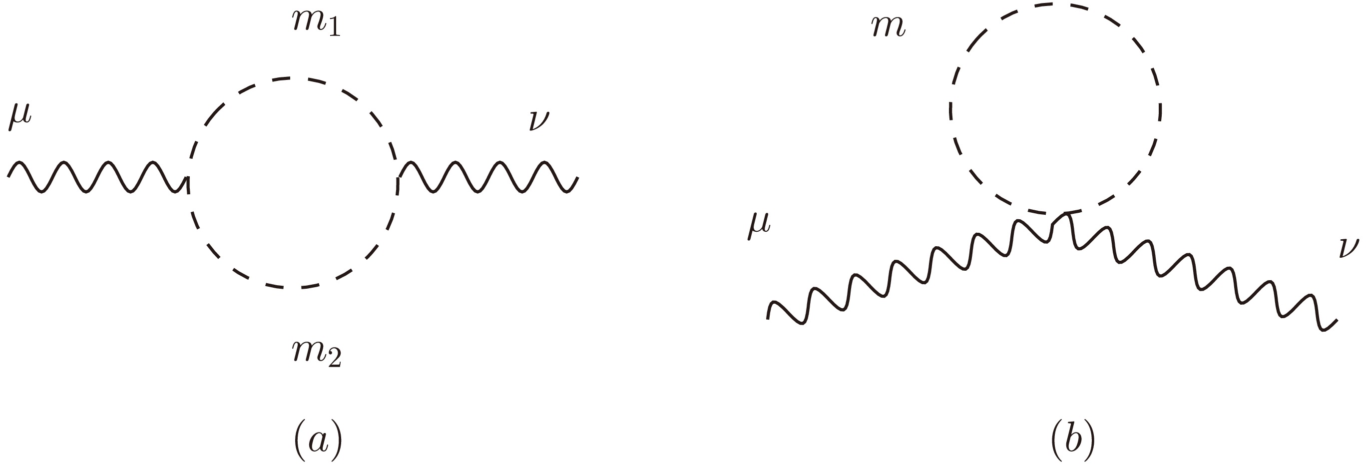 $ \begin{aligned}[b] \mathcal{M}_a=&-\mathcal{C}_a\{4B_{22}(p^2;m_1,m_2)g_{\mu\nu}\\&+[B_0+4B_1+4B_{21}](p^2;m_1,m_2)p_{\mu}p_{\nu}\},\\ \mathcal{M}_b=&\mathcal{C}_bA_0(m)g_{\mu\nu}. \end{aligned} $