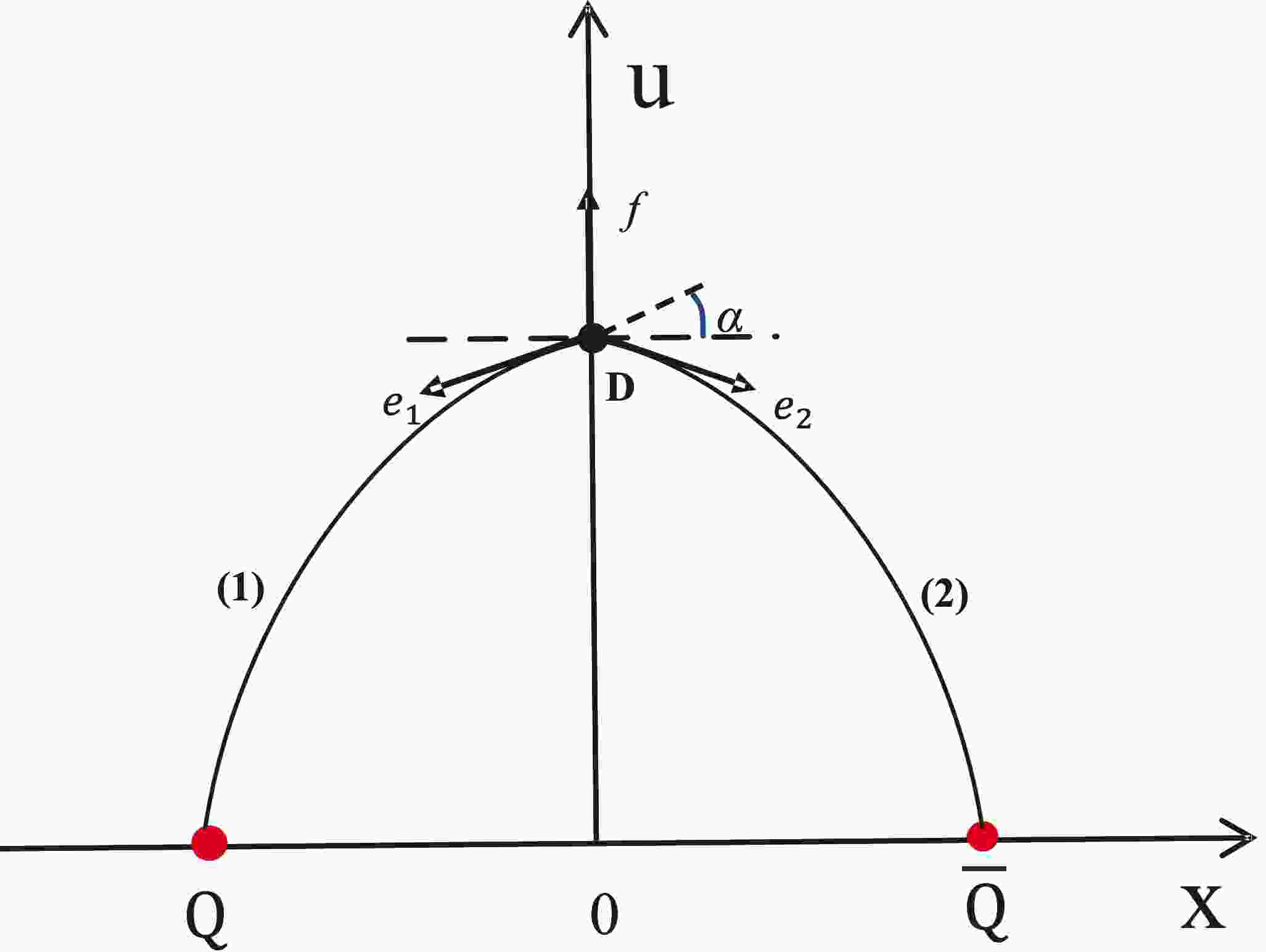 Figure 1.  (color online) Geometric setup of the hybrid meson model [75]. The quark and antiquark are shown as red markers along the x-axis, whereas the holographic defect is represented by a black symbol on the u-axis. The black lines connecting the defect to the quarks represent fundamental strings. The quantities $ e_1 $ and $ e_2 $ denote the tensions of strings (1) and (2), respectively. The angle between string (1) and the x-axis is denoted by α.