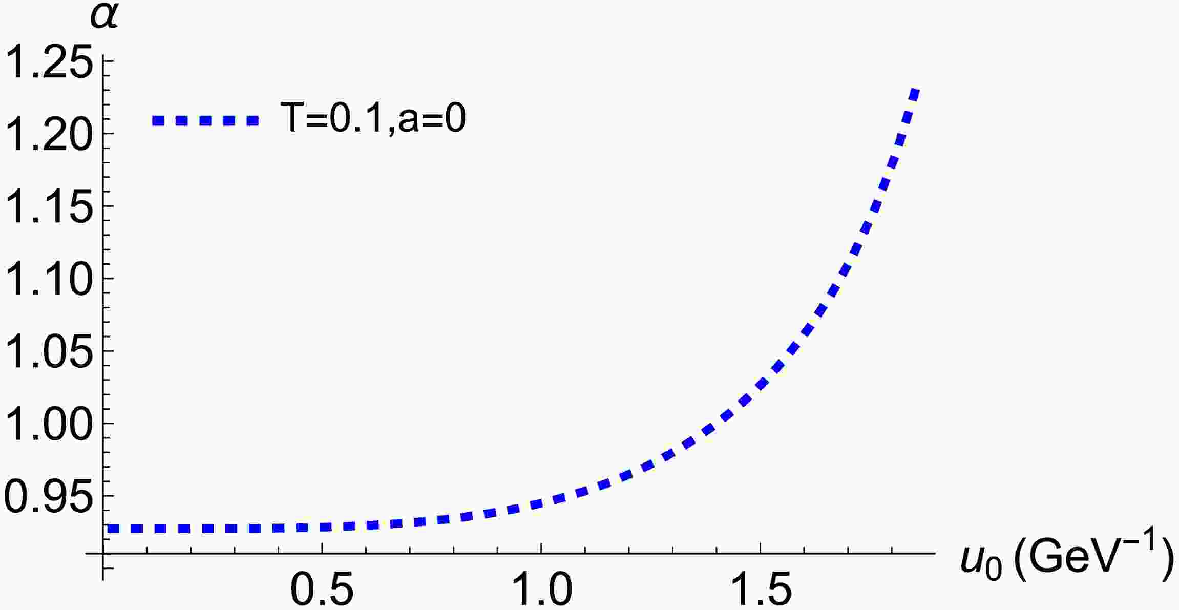 Figure 2.  (color online) Angular profile α as a function of the bulk turning point $ u_0 $ for the isotropic case ($ a = 0 $), evaluated at the thermal scale $ T = 0.1\,{\rm{GeV}} $.