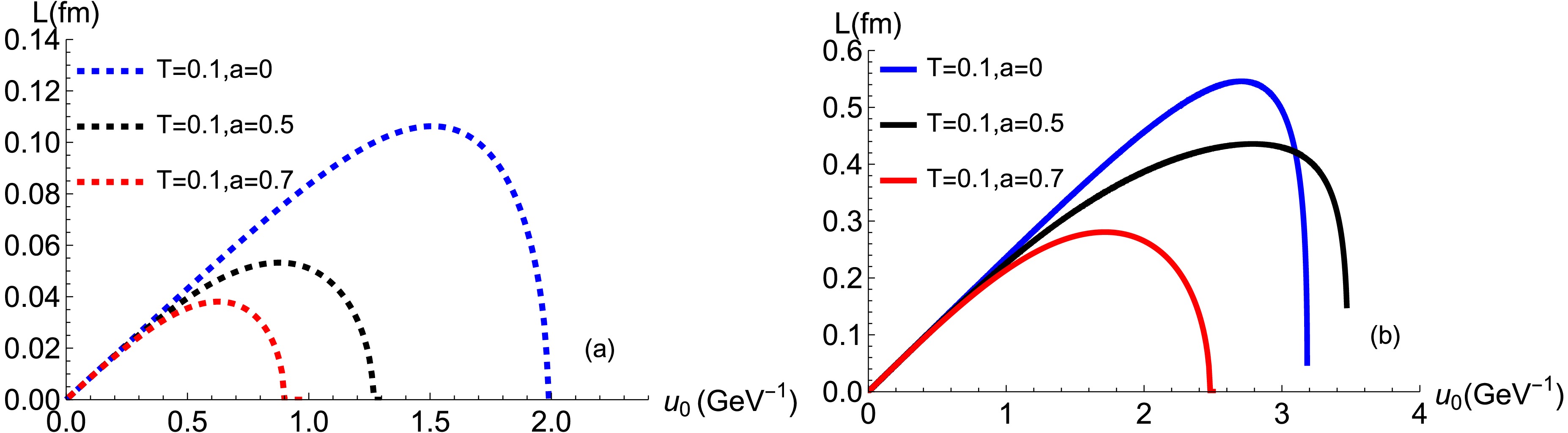Figure 4.  (color online) Dependence of the separation distance on $ u_0 $ for the $ \Sigma_{g}^{+} $ and $ \Sigma_{u}^{-} $ channels at $ T = 0.1\,{\rm{GeV}} $ and for different values of the anisotropy parameter a. (a) $ \Sigma_{u}^{-} $: Dashed blue, black, and red curves correspond to anisotropy parameters $ a=0 $, $ 0.5 $, and $ 0.7 $, respectively. (b) $ \Sigma_{g}^{+} $: Solidblue, black, and red curves correspond to anisotropy parameters $ a=0 $, $ 0.5 $, and $ 0.7 $, respectively.