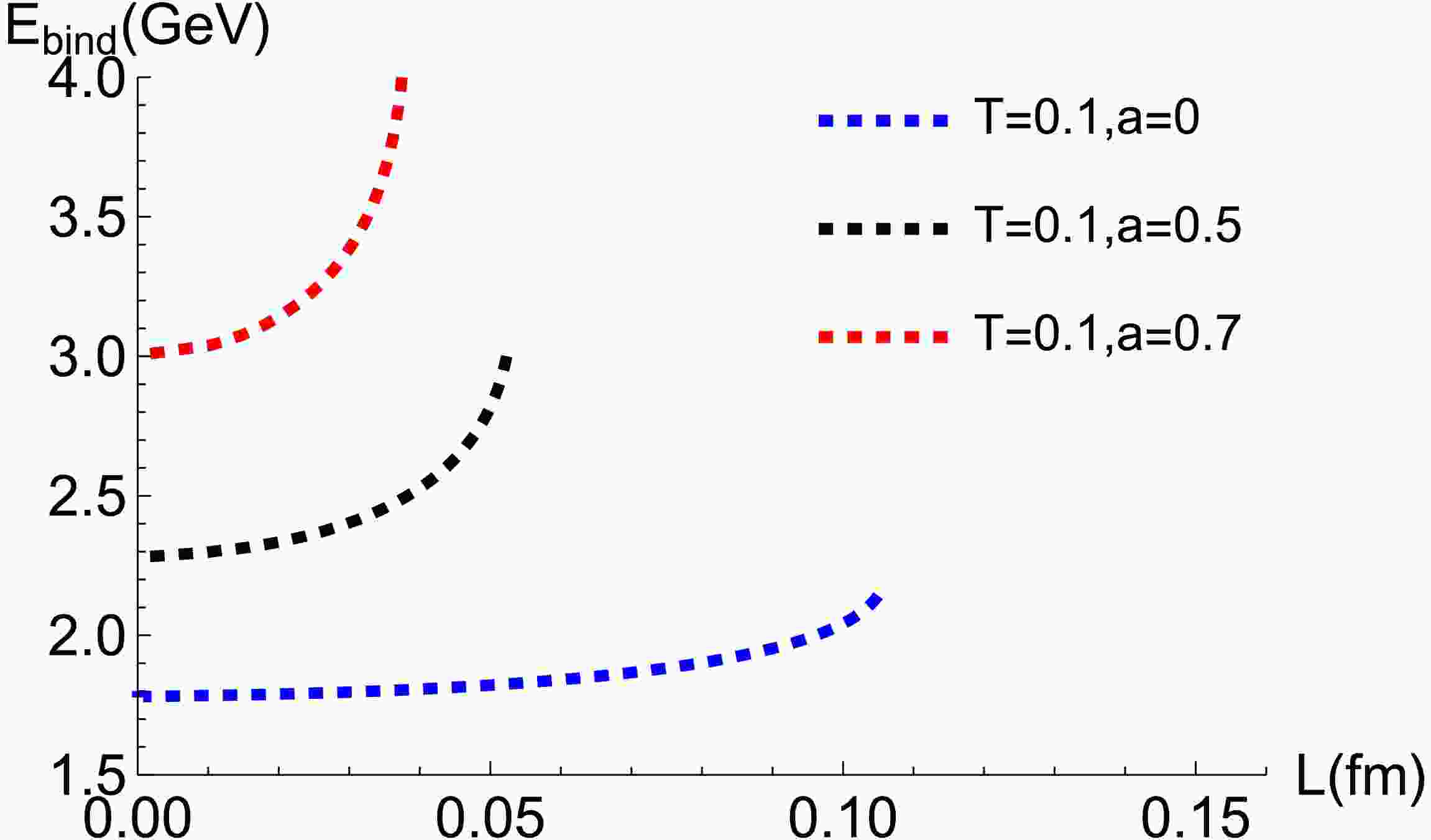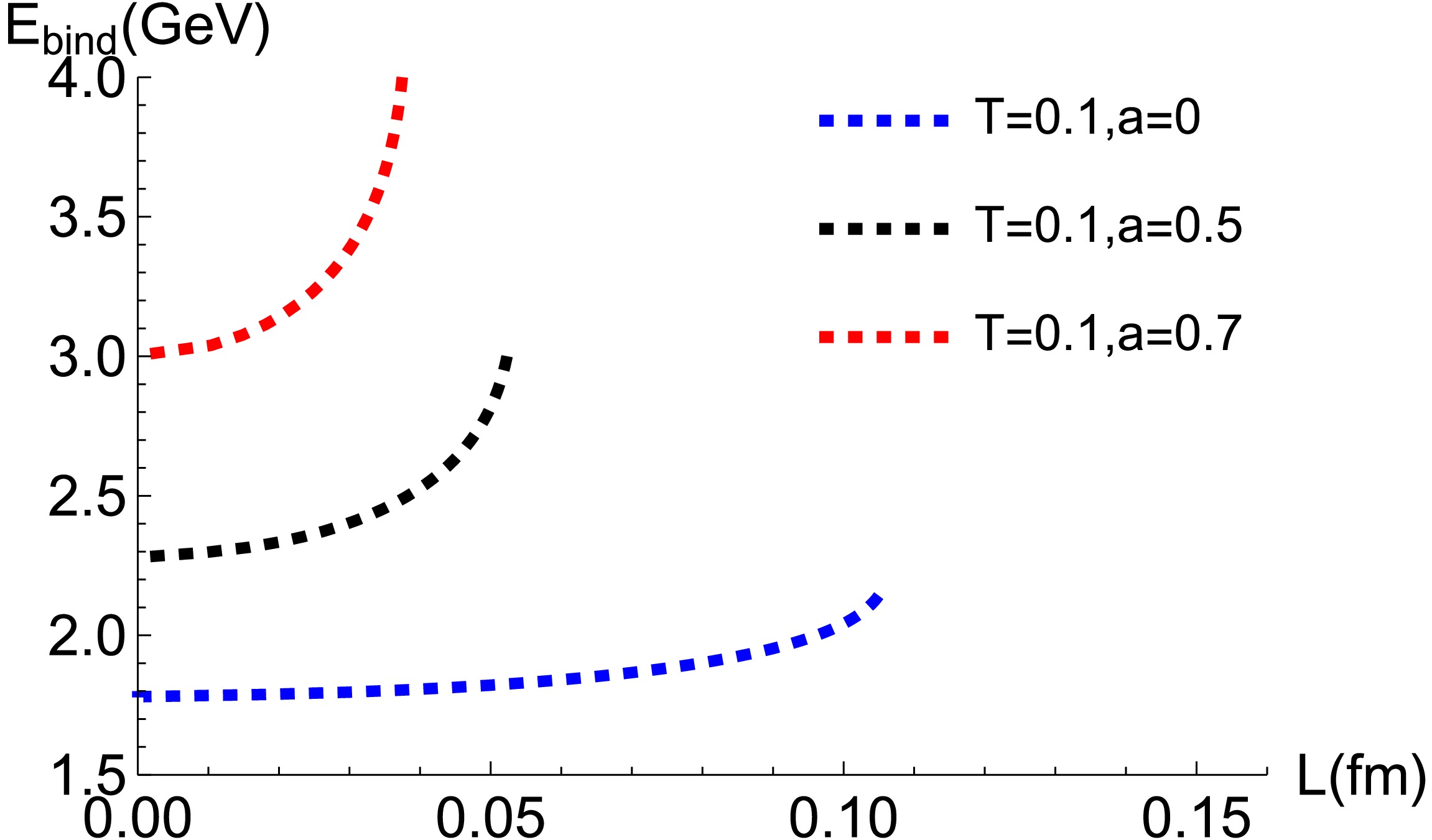 Figure 6.  (color online) Evolution of the binding energy of the $ \Sigma_{u}^{-} $ state as a function of the separation L at $ T = 0.1\,{\rm{GeV}} $. Dashed blue, black, and red curves represent anisotropy values $ a = 0 $, $ 0.5 $, and $ 0.7 $, respectively.