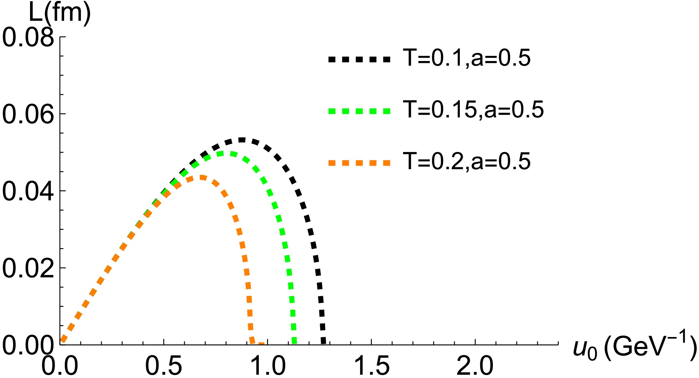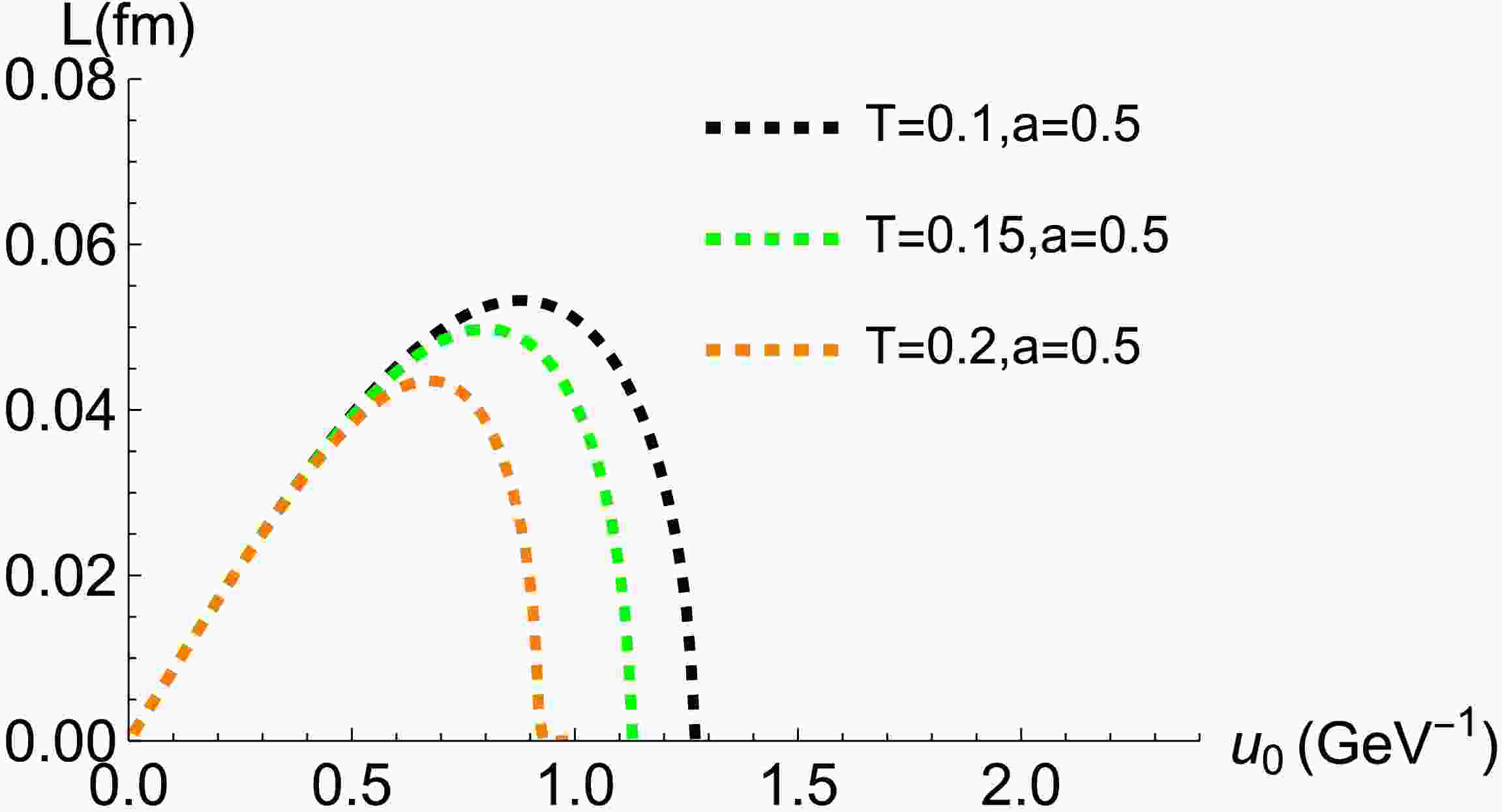 Figure 7.  (color online) Separation distance L as a function of the bulk turning point $ u_0 $ ($ a = 0.5 $). The black, green, and orange dashed lines correspond to thermal scales of $ 0.1 $, $ 0.15 $, and $ 0.2\,{\rm{GeV}} $, respectively.