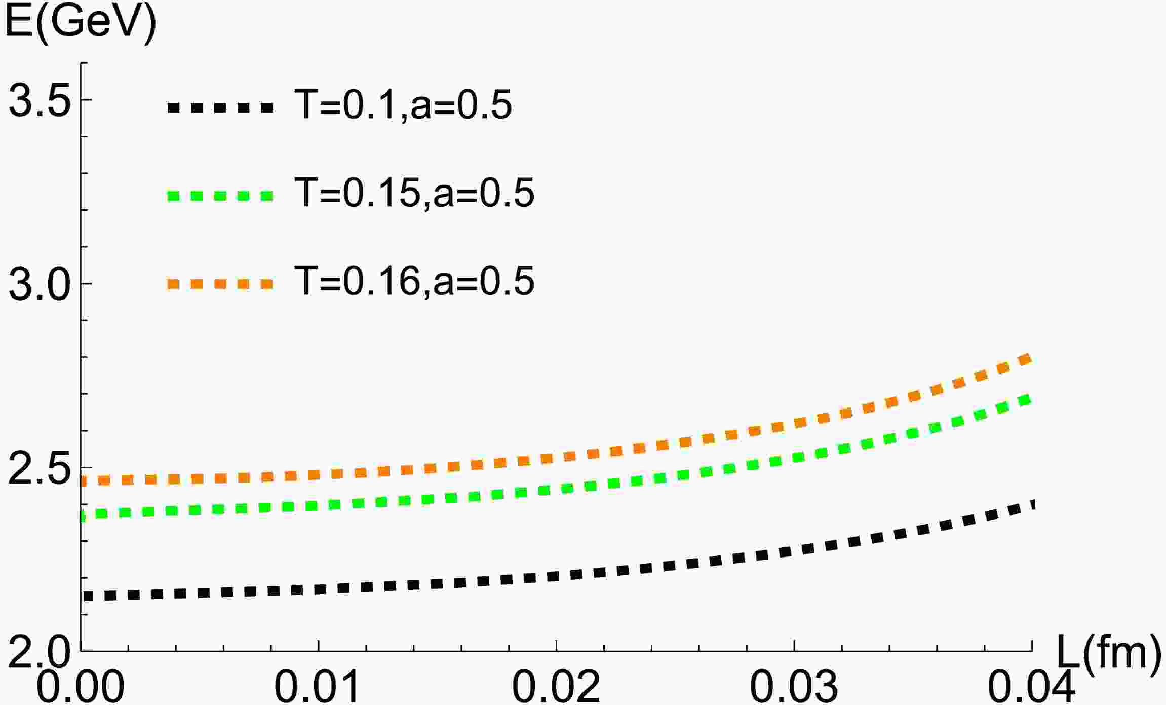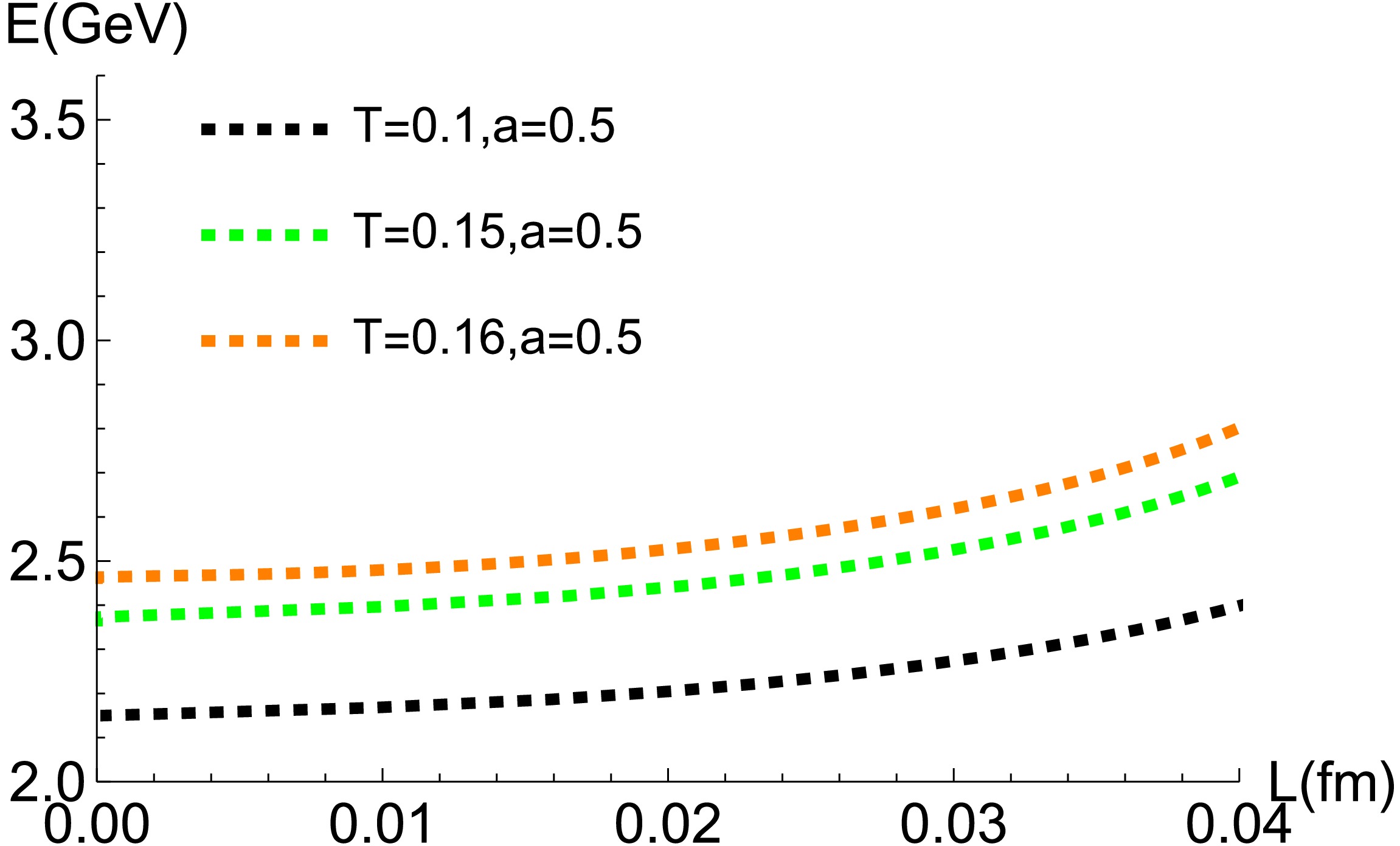 Figure 8.  (color online) The potential energy E of the $ \Sigma_{u}^{-} $ state as a function of L for $ a=0.5 $. The curves represent temperatures of $ 0.1\,{\rm{GeV}} $ (black dashed), $ 0.15\,{\rm{GeV}} $ (green dashed), and $ 0.16\,{\rm{GeV}} $ (orange dashed).