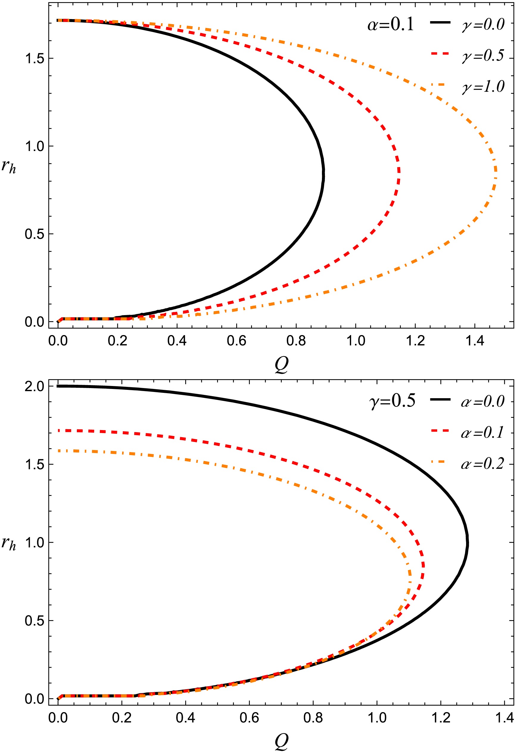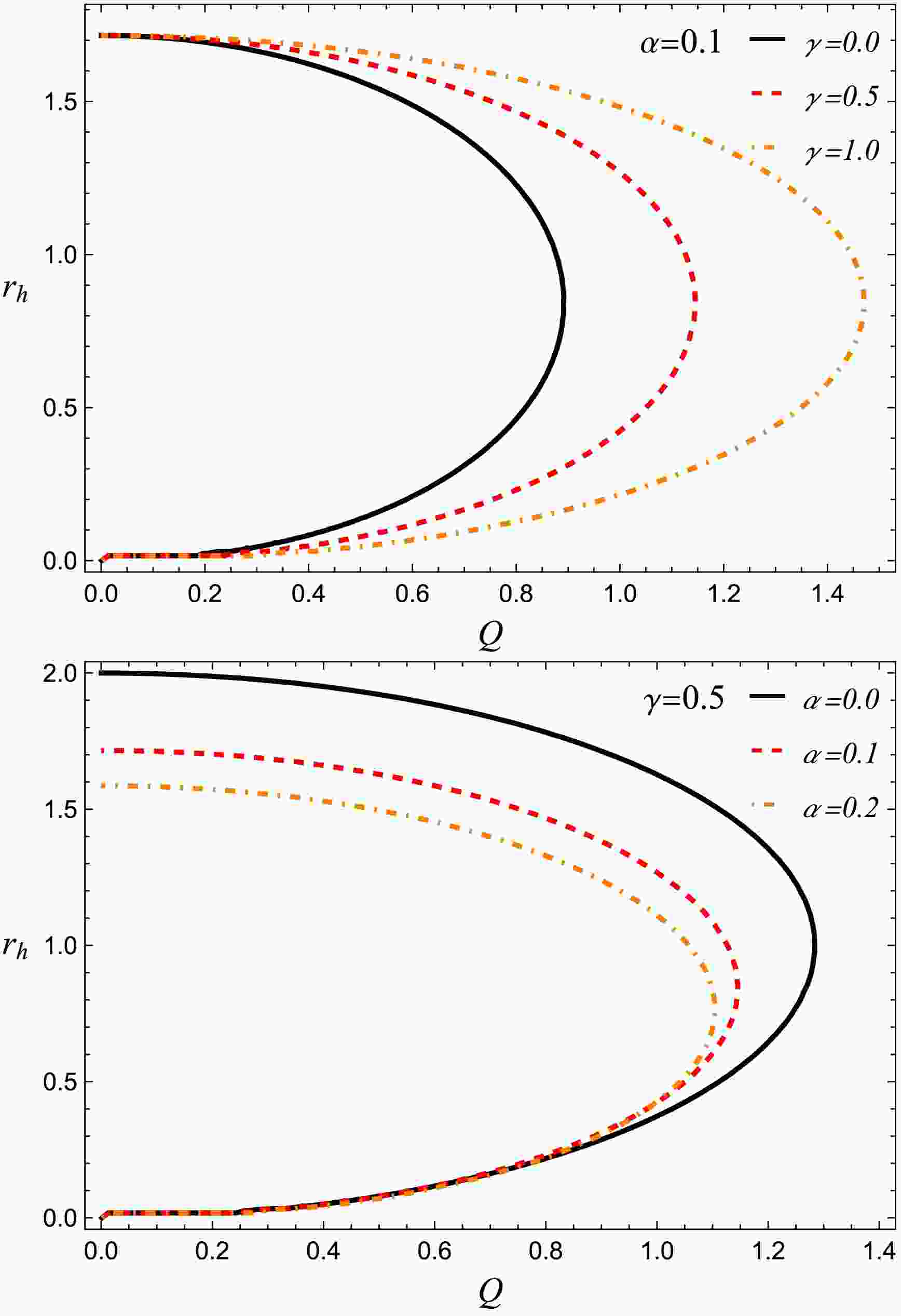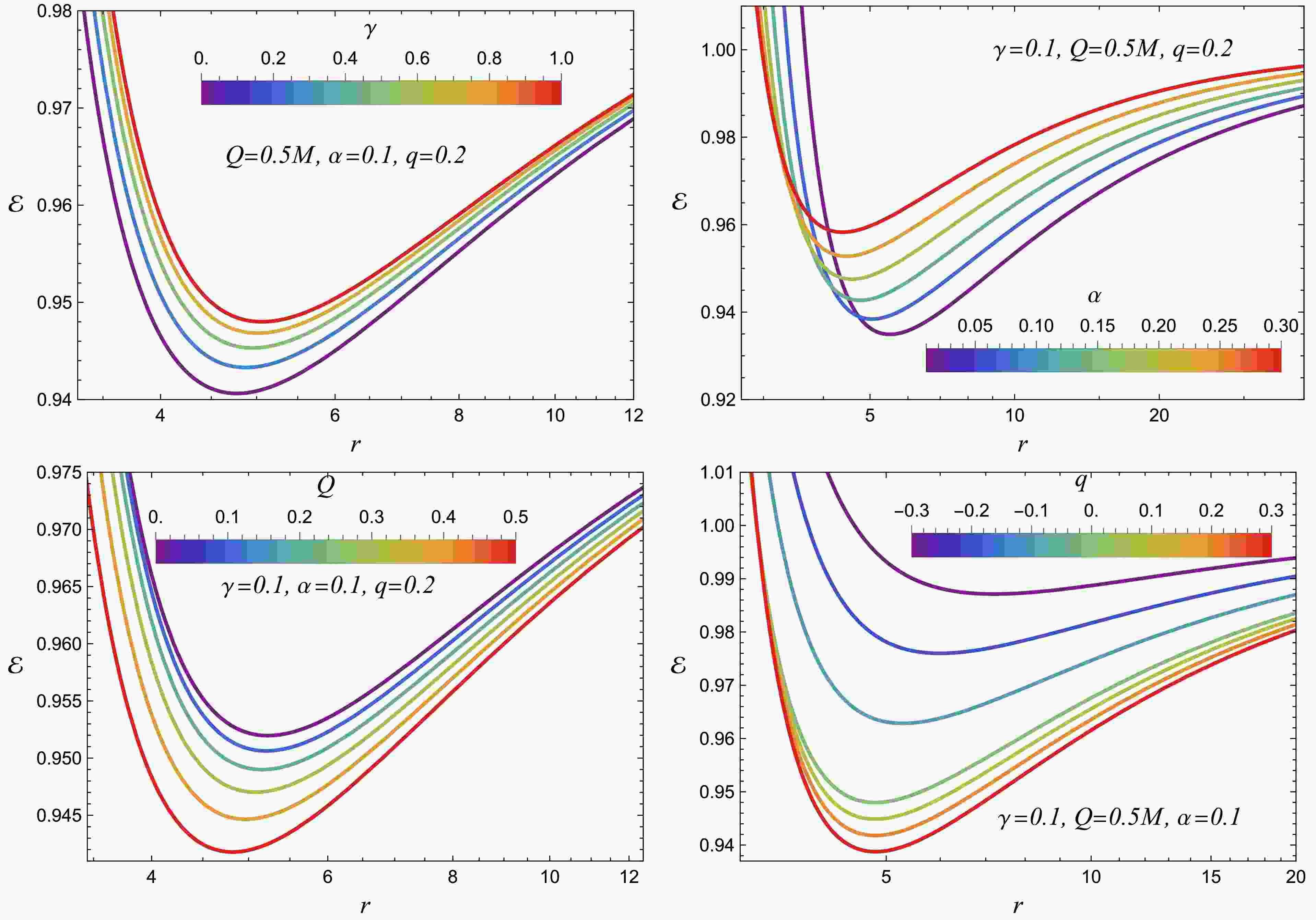 The top-left panel illustrates the effect of γ for a positively charged particle ($ q = 0.2 $). The ISCO radius is asymmetric in Q: for negative Q, the orbits lie closer to the horizon, whereas for positive Q they move outward. Increasing γ has opposite effects in these two regimes: it increases $ r_{ISCO} $ for $ Q \lt 0 $ but decreases it for $ Q \gt 0 $. Thus, γ influences the orbital structure asymmetrically, enhancing or suppressing the effective Coulomb interaction depending on the relative signs of the charges.