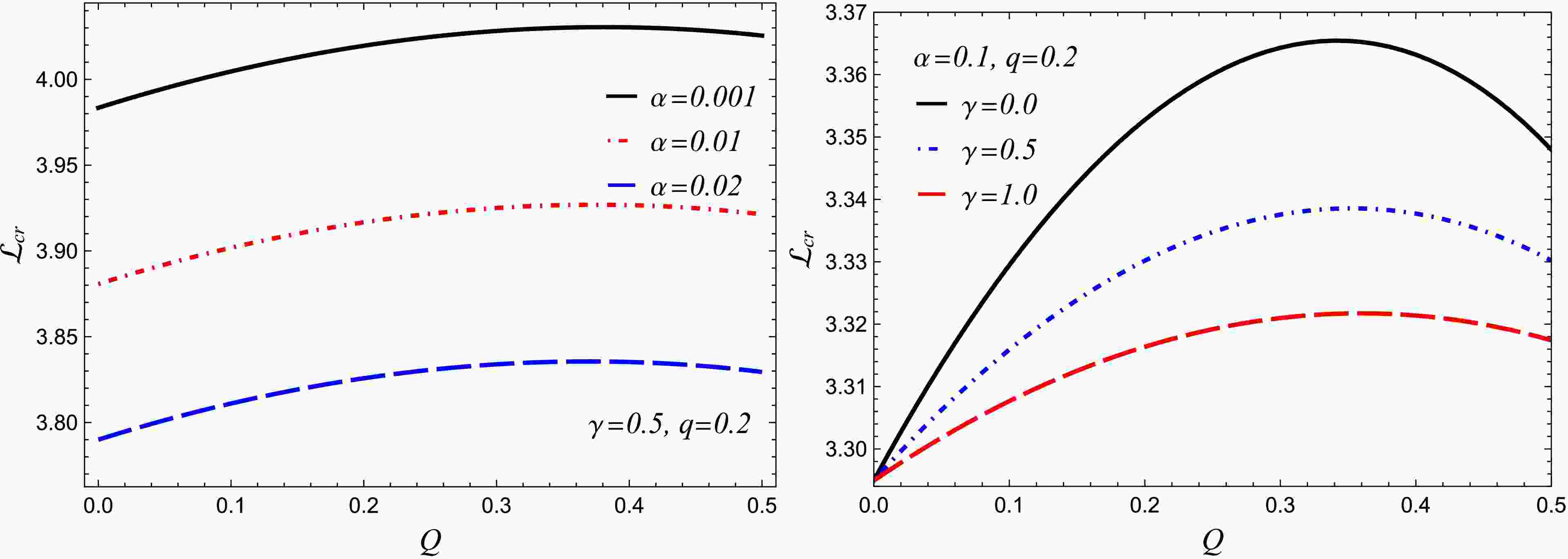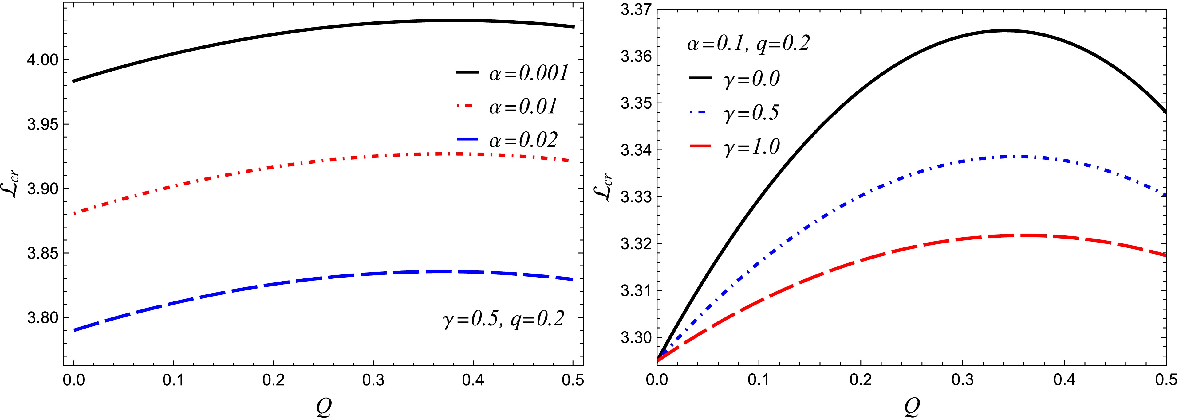 Figure 10.  (color online) Dependence of the critical angular momentum $ {\cal{L}}_{cr} $ on α (left panel) and on γ (right panel) for various values of the black-hole and particle parameters.