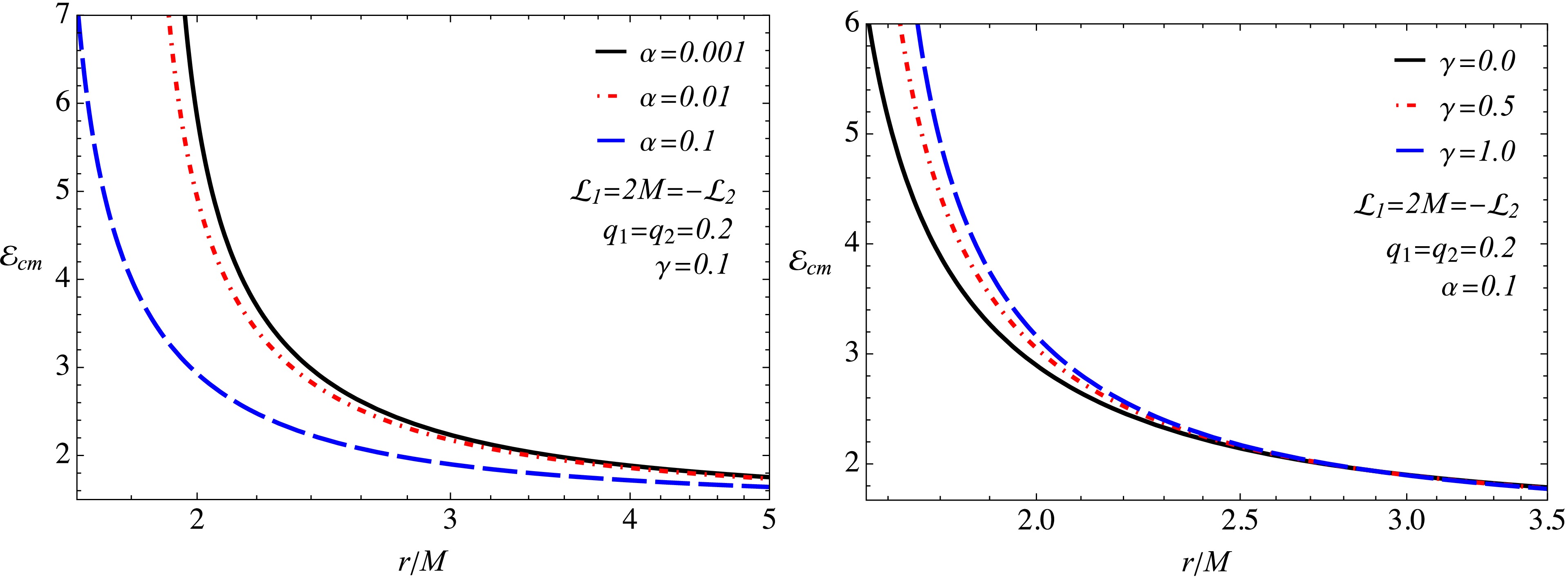 The right panel demonstrates the effect of the nonlinear electrodynamics parameter γ. In contrast to α, an increase in γ causes the energy $ {\cal{E}}_{cm} $ to grow, especially near the BH horizon. This occurs because stronger nonlinear electrodynamics increases the BH's effective charge, thereby strengthening the Coulomb repulsion between the charged particles and raising their relative velocity before the collision. Thus, the parameter γ enhances the BSW acceleration mechanism, whereas the parameter α suppresses it.