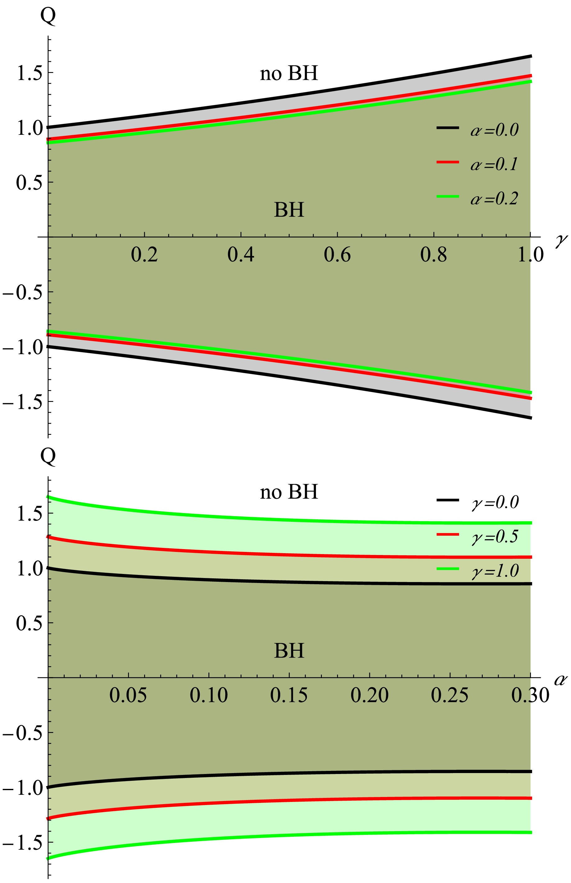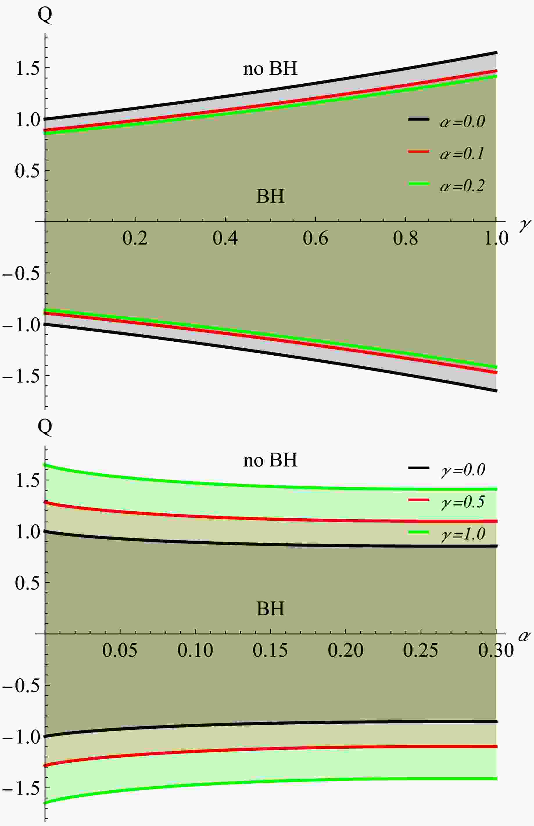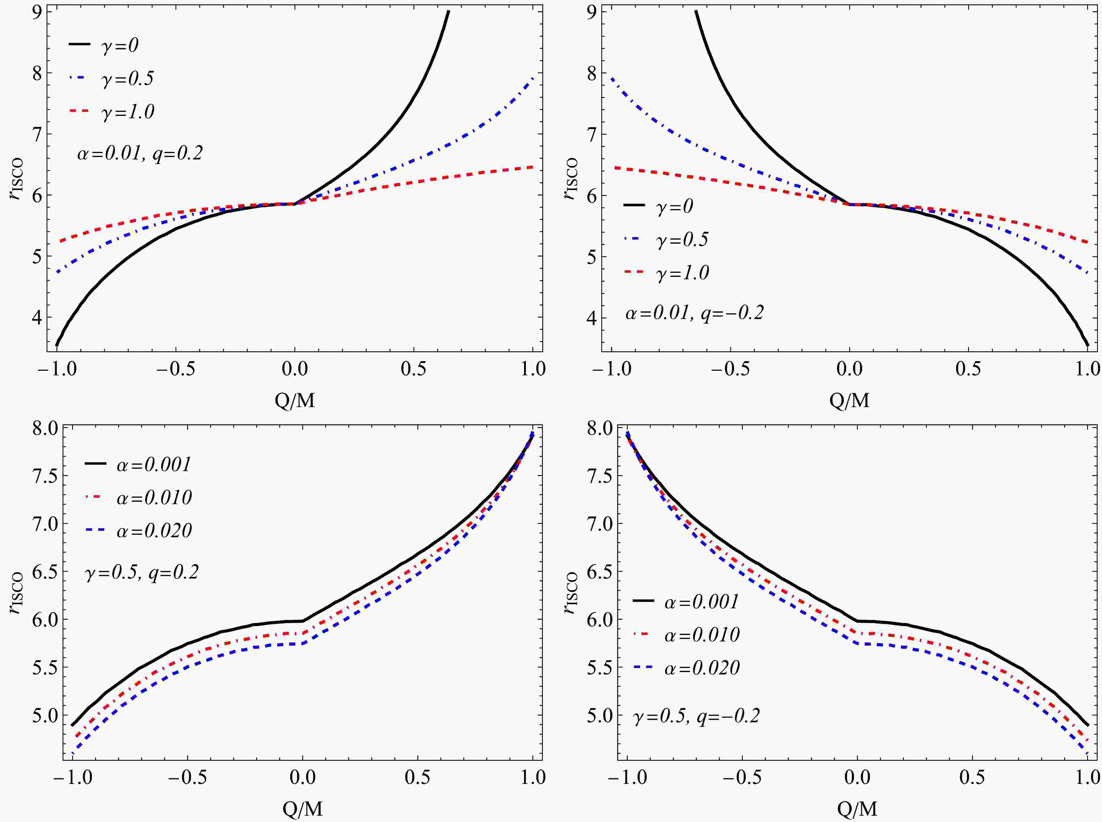 The top-right panel shows the same dependence for a negatively charged particle ($ q = -0.2 $). Here, the trends are reversed: $ r_{ISCO} $ decreases with increasing γ for $ Q \lt 0 $ (like-charged configuration) and increases for $ Q \gt 0 $ (oppositely charged configuration). All curves intersect near $ Q = 0 $, where the effect of γ vanishes and $ r_{ISCO} $ coincides with the nearly-Schwarzschild value, slightly reduced by the PFDM contribution.