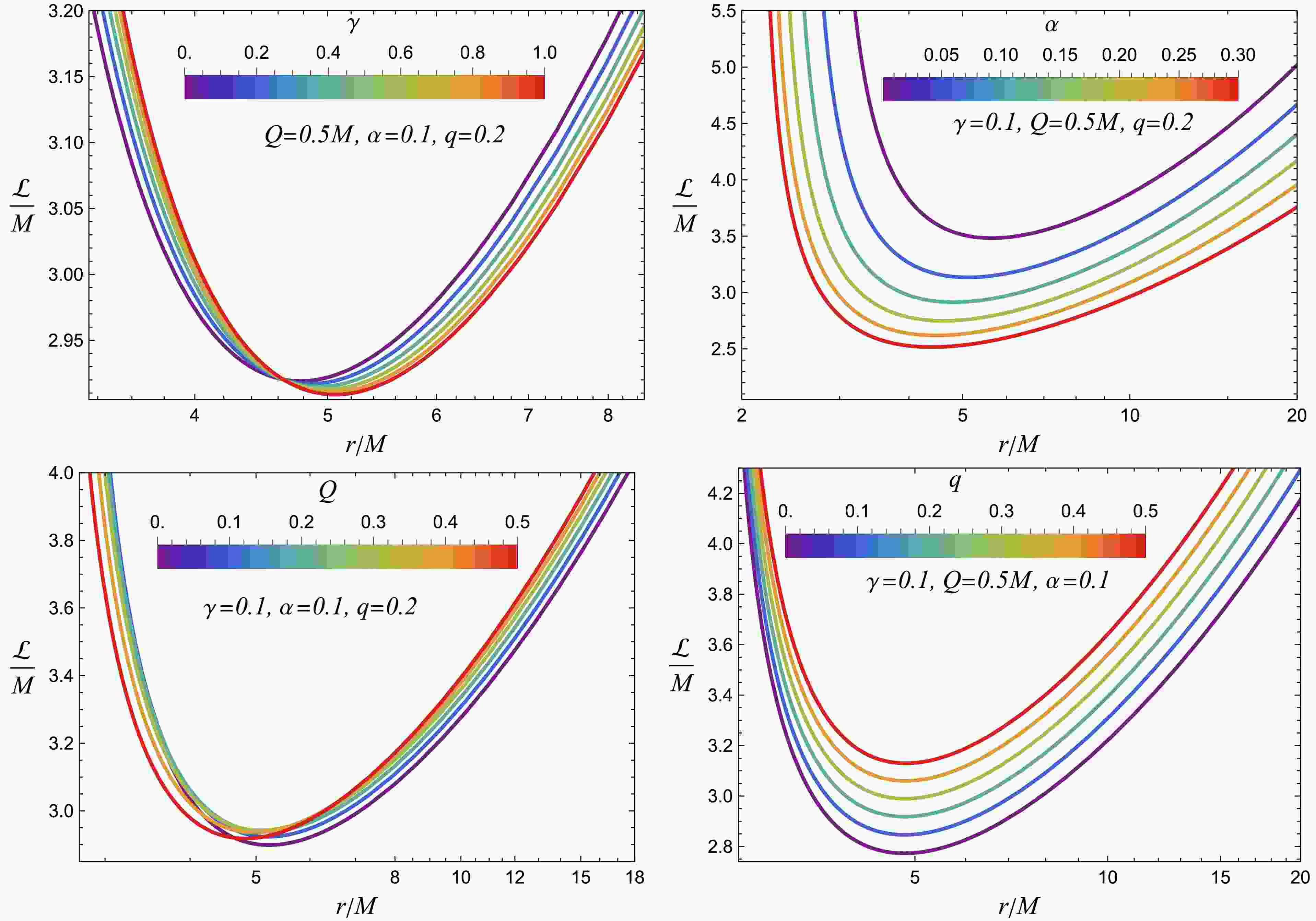 Figure 5 shows the radial dependence of the specific angular momentum $ {\cal{L}} $ of charged particles moving in circular orbits around charged ModMax BHs embedded in a PFDM environment, for various choices of model parameters. The top-left panel illustrates the effect of the ModMax parameter γ: as γ increases, the values of $ {\cal{L}} $ decrease and the minimum becomes less pronounced, indicating a reduced contribution from nonlinear electrodynamics and a lower angular momentum required to maintain circular orbits. The top-right panel shows the influence of the PFDM parameter α. Increasing α likewise reduces $ {\cal{L}} $ and shifts the minimum toward smaller radii $ r/M $, reflecting the weakening of the effective gravitational attraction due to the presence of PFDM. The bottom-left panel displays the effect of the BH charge Q, for which the behavior of $ {\cal{L}}(r) $ is slightly non-monotonic: at smaller Q the angular momentum increases, whereas at larger Q it decreases slightly, reflecting competition between gravitational and electromagnetic effects. Finally, the bottom-right panel illustrates the dependence on the test particle charge q; increasing q yields higher $ {\cal{L}} $ values, as electrostatic repulsion requires a larger angular momentum to maintain stable orbits.