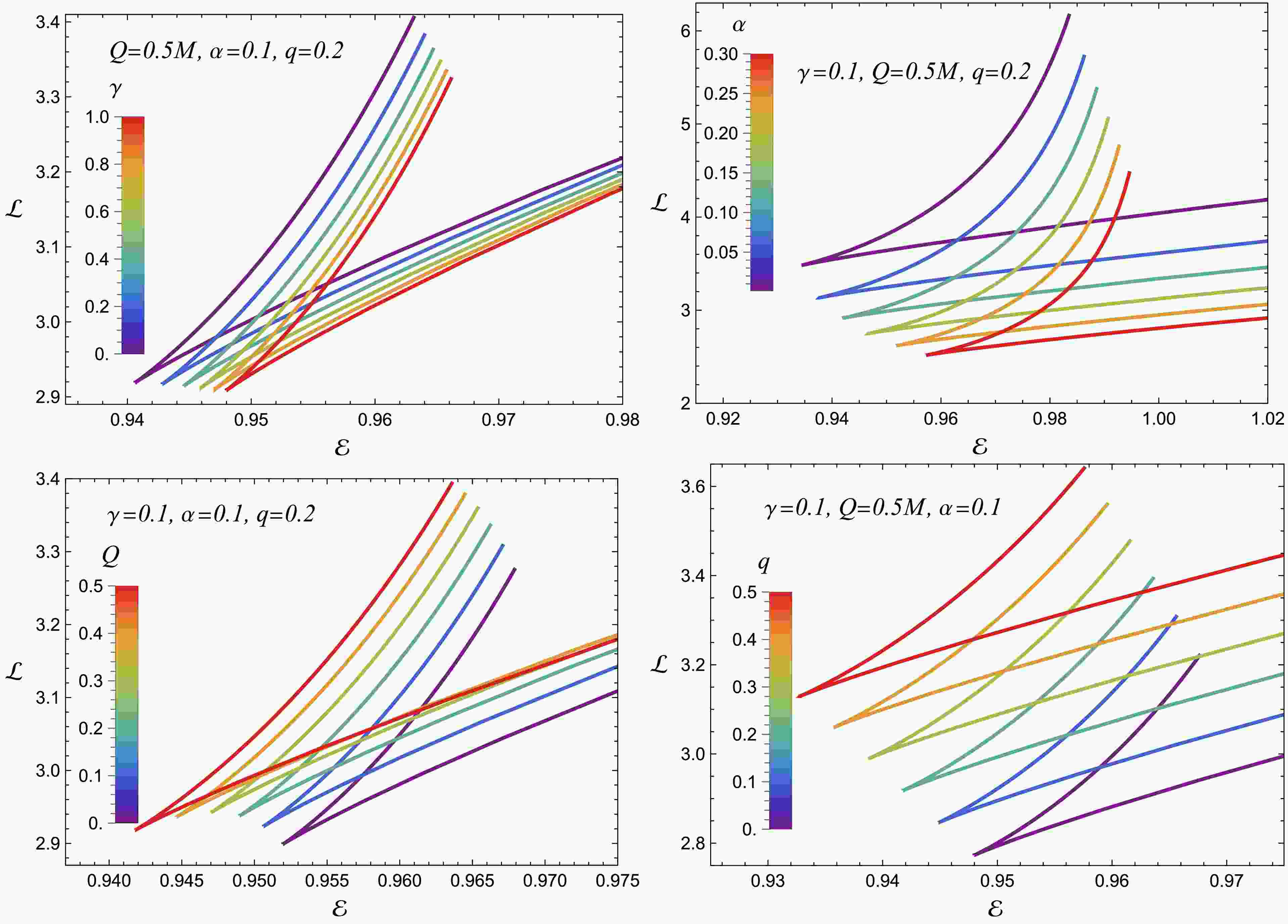 Figure 6 shows the relationship between the energy $ {\cal{E}} $ and the angular momentum $ {\cal{L}} $ for charged particles moving in circular orbits around charged ModMax BHs surrounded by PFDM. The top-left panel shows the influence of the ModMax parameter γ: as γ increases, the values of $ {\cal{L}} $ decrease for a fixed $ {\cal{E}} $, indicating a weaker electromagnetic contribution and a reduction in the angular momentum required to maintain a circular orbit. The top-right panel illustrates the effect of the PFDM parameter α: increasing α decreases $ {\cal{L}} $, attributable to a weakening of the effective gravitational attraction induced by PFDM. The bottom-left panel illustrates the dependence on the BH charge Q: as Q increases, the required angular momentum $ {\cal{L}} $ grows for a given energy, since electrostatic repulsion partially counteracts gravitational attraction. Finally, the bottom-right panel shows the influence of the test-particle charge q: when q increases (for charges of the same sign as Q), the required angular momentum rises due to electrostatic repulsion, whereas for opposite charge signs $ {\cal{L}} $ decreases due to electrostatic attraction.