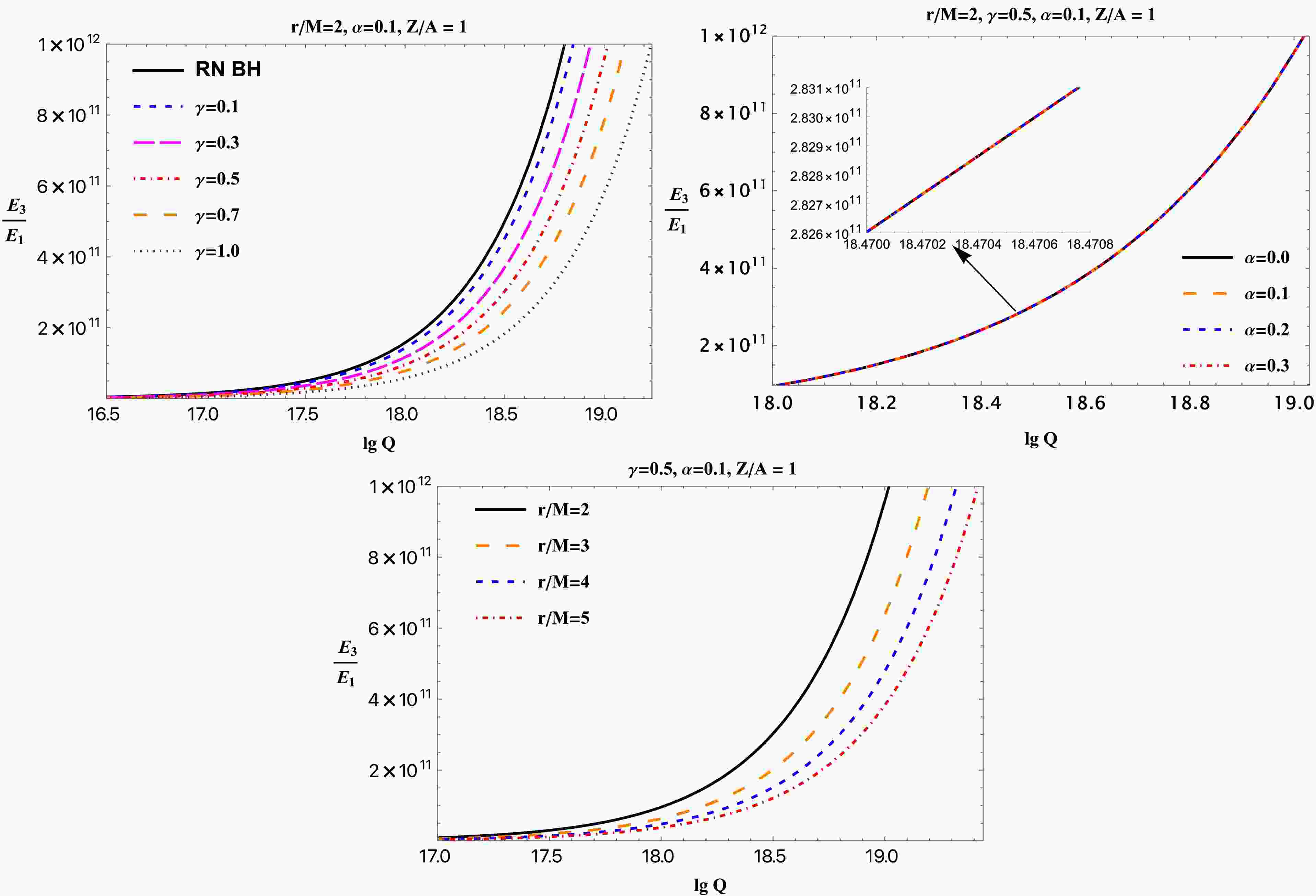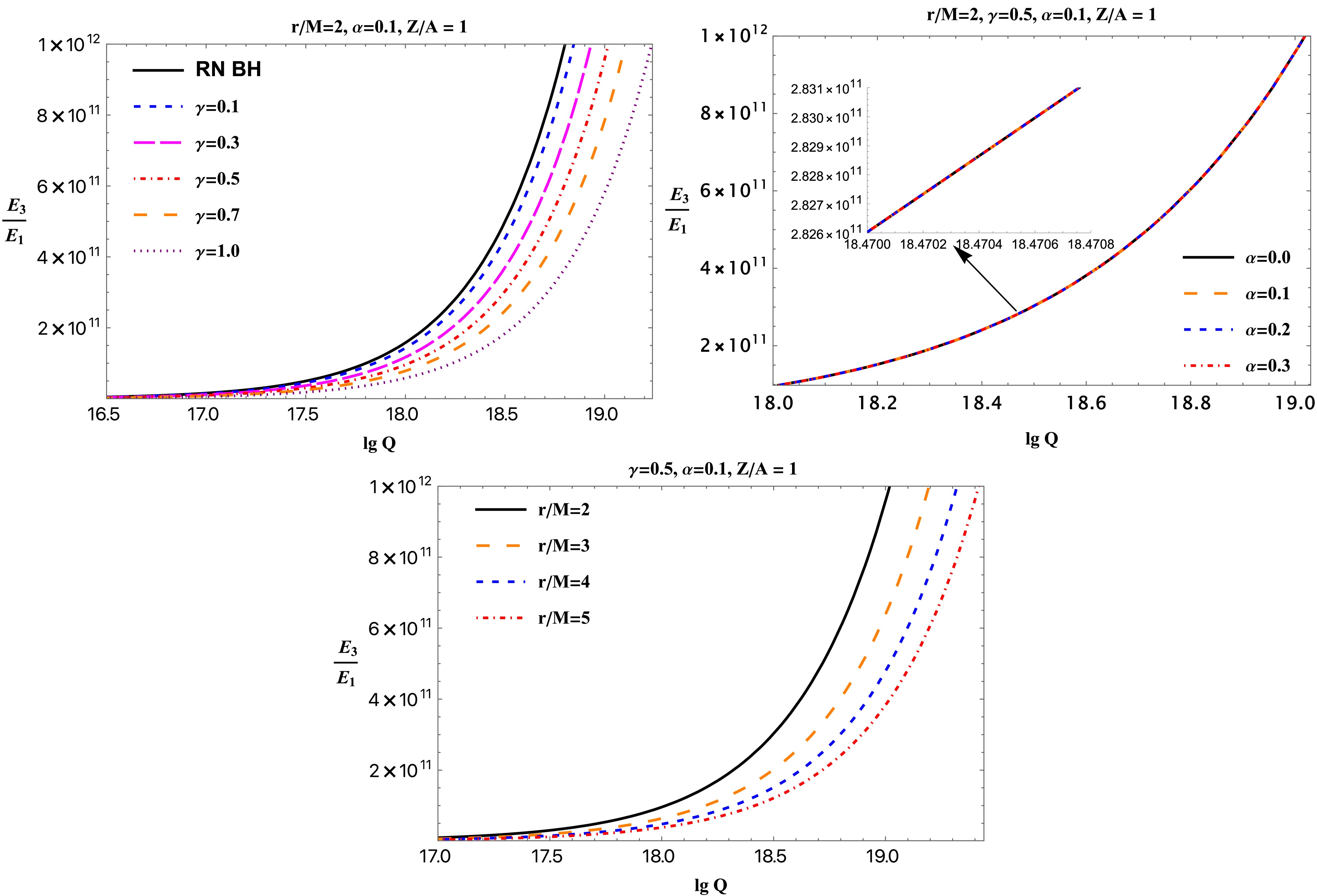 The top-left panel shows $ E_3/E_1 $ as a function of the BH electric charge for several values of the ModMax parameter γ. The solid black curve represents the RN BH, the reference case. As γ increases, the curves shift downward, indicating that a larger γ weakens the efficiency of particle energy extraction (acceleration). For the same Q, BHs with higher γ yield smaller $ E_3/E_1 $, showing that the electromagnetic nonlinearity suppresses the Coulomb-driven energy gain. The top-right panel displays the effect of the PFDM parameter α on the efficiency. For all values of α, the curves are nearly identical because α does not contribute to the Coulomb interaction (20), which provides the dominant contribution to the efficiency (41). The bottom panel shows the dependence on the ionization point: the farther the ionization occurs, the less efficient the electric Penrose process becomes, owing to the weakening of the Coulomb interaction.