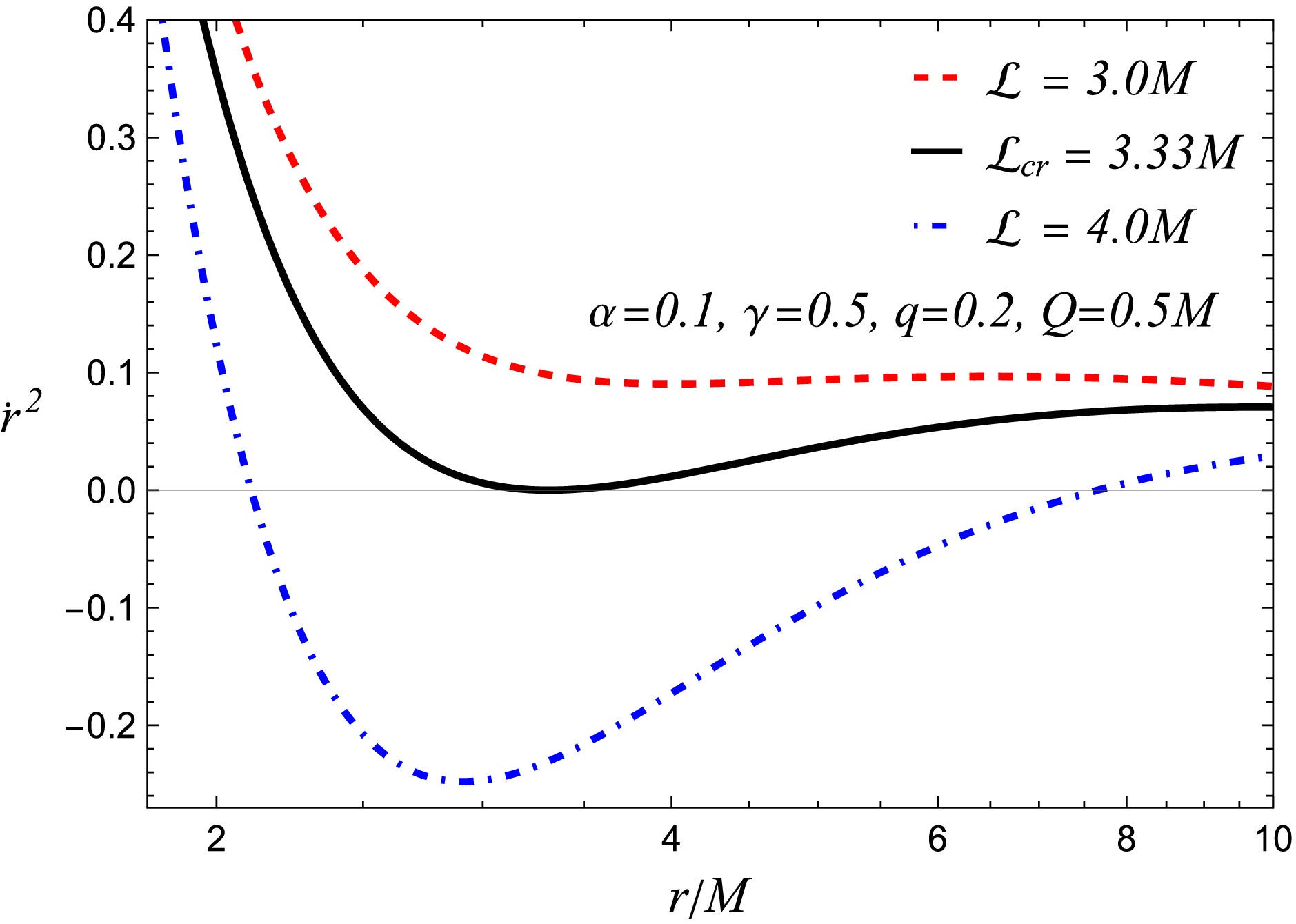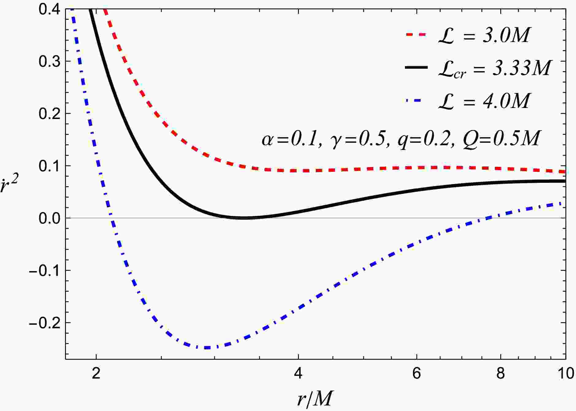 The critical value of the angular momentum is obtained by imposing two conditions on the radial motion of the particle: (a) $ \dot{r} = 0 $, which corresponds to a turning point of the trajectory, and (b) $ d\dot{r}/dr = 0 $, which ensures an extremum of the radial-velocity function (see Figure 9). As the angular momentum increases ($ {\cal{L}} \gt {\cal{L}}_{cr} $) beyond this threshold, the squared radial velocity becomes negative, indicating that particles are no longer able to approach the central object for such values. Accordingly, we examine the admissible range of angular momentum and determine the corresponding critical values.